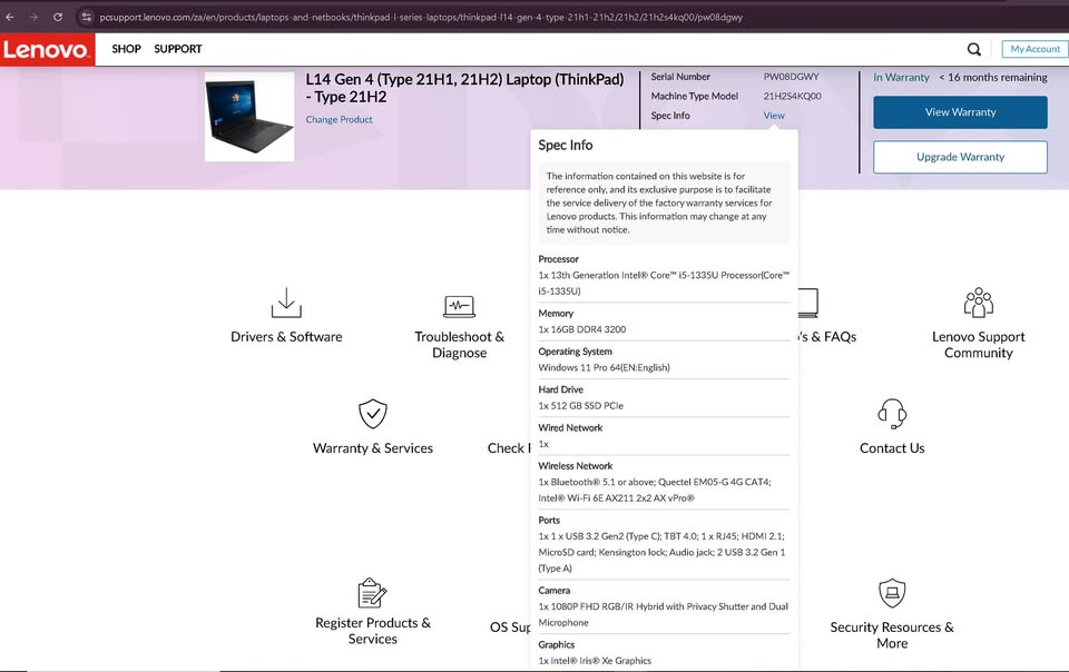 Specification:. Processor 1x 13th Generation Intel® Core™ i5-1335U Processor(Core™ i5-1335U) Memory 1x 16GB DDR4 3200 Operating System Windows 11 Pro 64(EN:English) Hard Drive 1x 512 GB SSD PCIe Wired Network 1x Wireless Network 1x Bluetooth® 5.1 or above; Quectel EM05-G 4G CAT4; Intel® Wi-Fi 6E AX211 2x2 AX vPro® Ports 1x 1 x USB 3.2 Gen2 (Type C); TBT 4.0; 1 x RJ45; HDMI 2.1; MicroSD card; Kensington lock; Audio jack; 2 USB 3.2 Gen 1 (Type A) Camera 1x 1080P FHD RGB/IR Hybrid with Privacy Shutter and Dual Microphone Graphics 1x Intel® Iris® Xe Graphics Monitor 14" FHD Form Factor Notebook