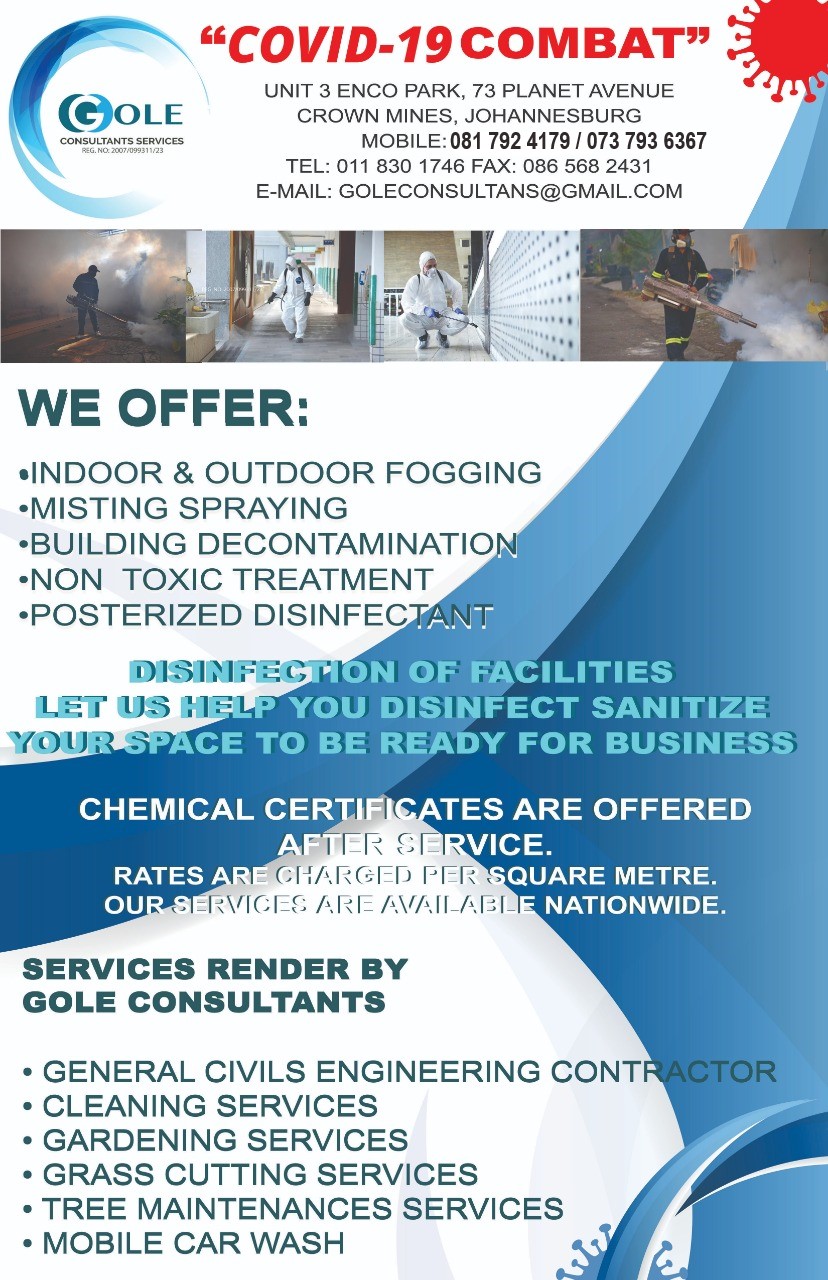 I am Offering Disinfecting/fogging Services Around Gauteng @ R20 per Square Meter I also Provide Certificate after work