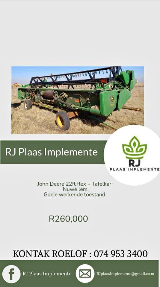 John Deere 22ft flex + Tafelkar Nuwe lem Goeie werkende toestand R260 000 + BTW KONTAK ROELOF :