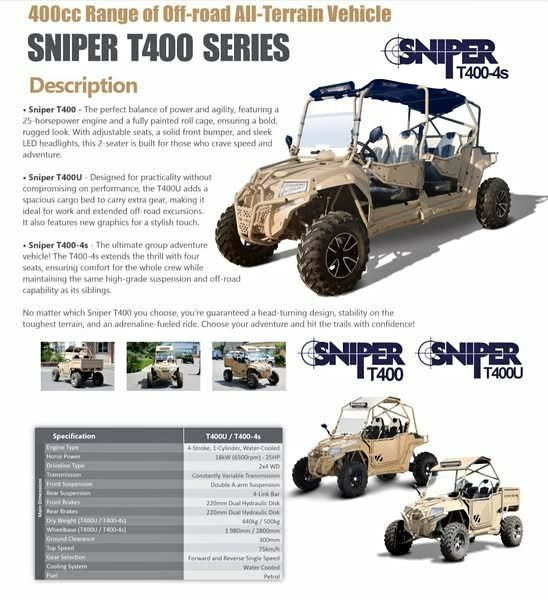 New Sniper T400 All Terrain Vehicles Available For Sale At Mad Farmer SA Zuid Street Middelburg Mpumalanga For All Your Farming Needs ** Warranties On All Our Equipment ** ** Full Parts And After Sales Service ** ** [hidden information] ** ** Call : [hidden information] ** ** Whatsapp : [hidden information] **