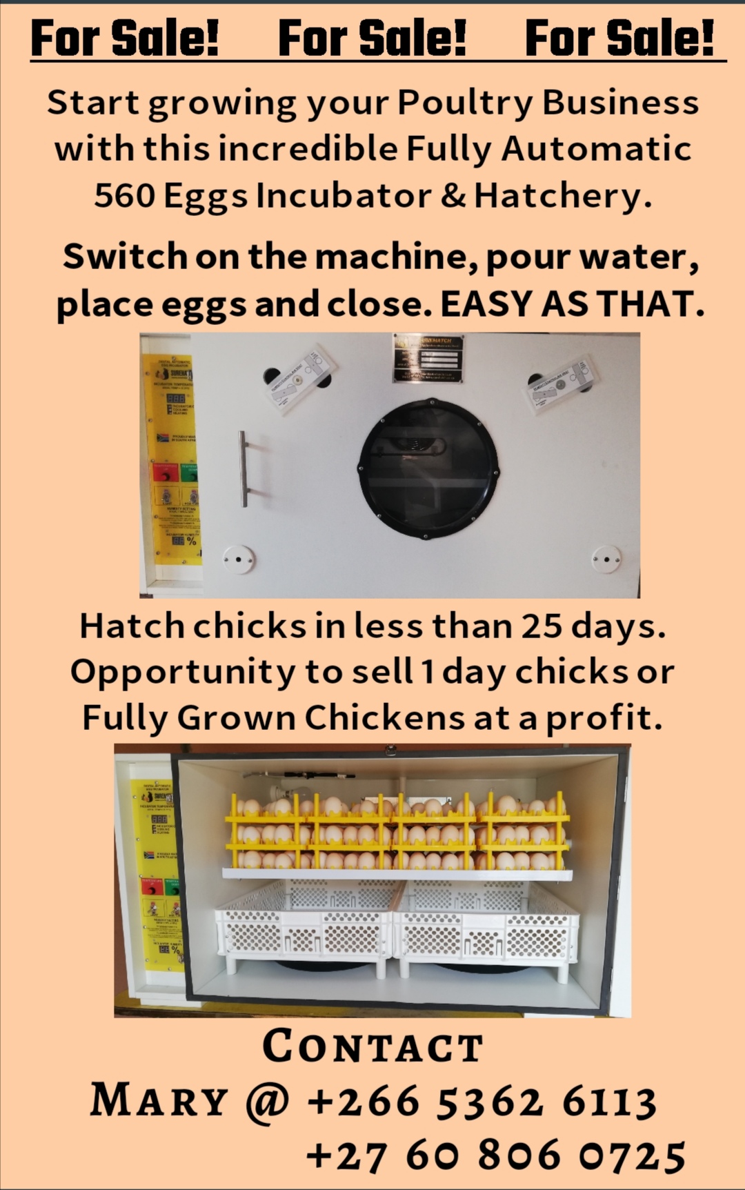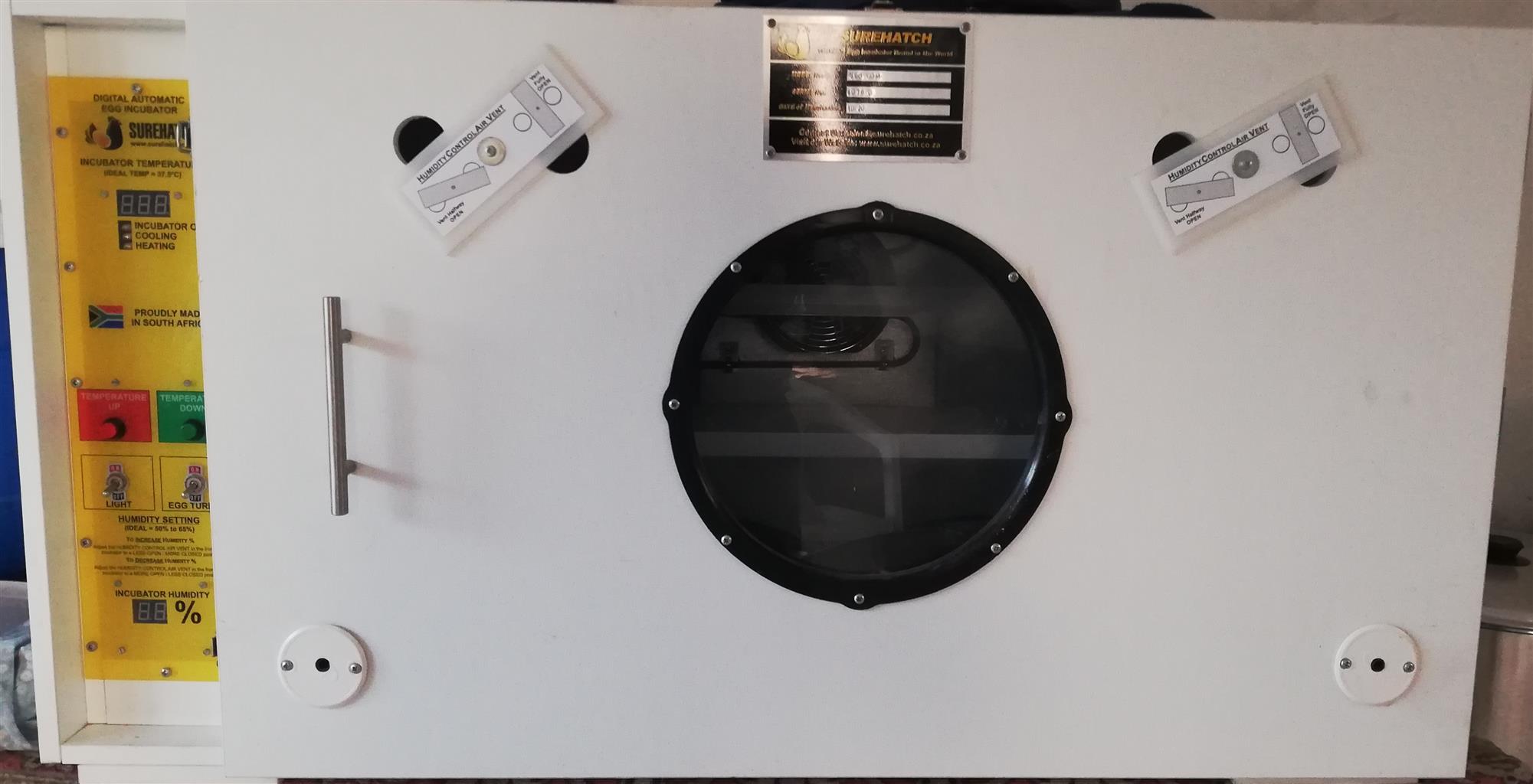 This 560 model Surehatch Incubator and Hatcher was only used three times. The machine is in good as new condition. I am selling the Machine because I am relocating.