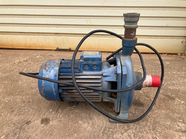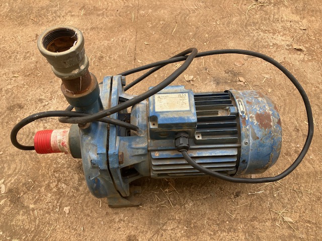 Runs on single phase or three phase (3.76 kw or 3kw) (12 or 7 amps) 50hz. Currently connected for three phase, 50 mm agricultural pipe and runs smoothly.
