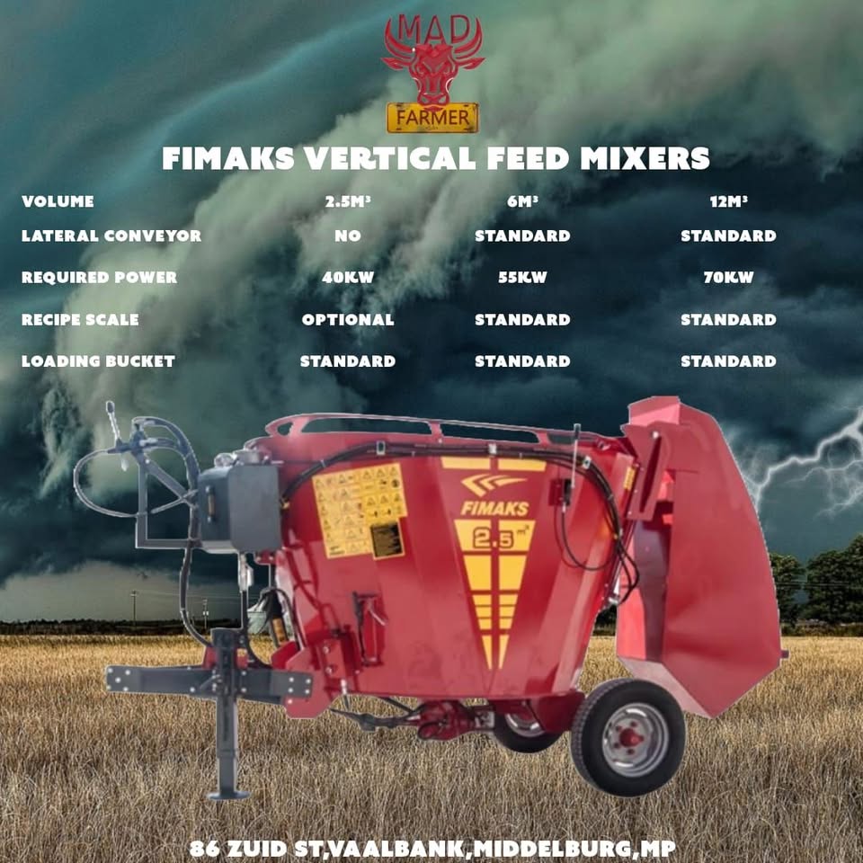 Fimaks Vertical Feed Mixers are available for purchase. Mad Farmer SA Middelburg MP is an authorized dealer for the Fimaks range of equipment, offering a 12-month warranty. For further information and pricing, please contact Brenda-Lee at 066 023 6258view more or WhatsApp 072 385 3768view more. #madfarmersa #agriculture #kinginfarming #feedyouranimals