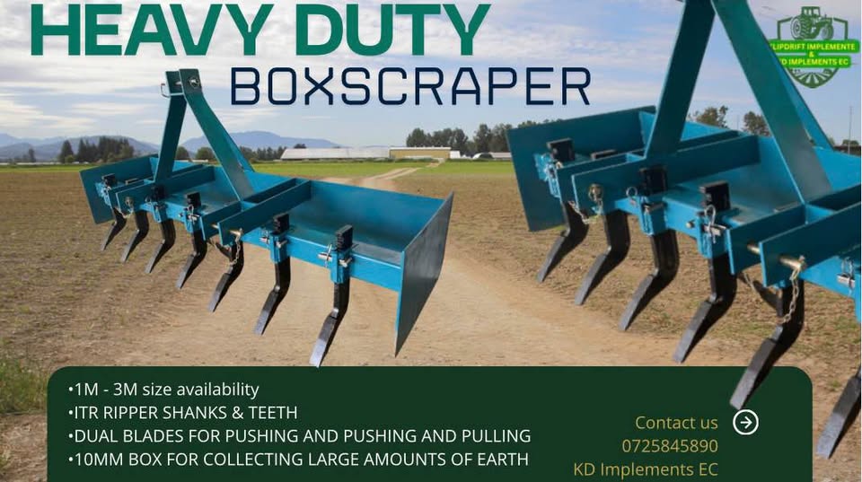 Size availability 1M - 3M All in one implements perfect for moving large amounts of earth, grassing land, levelling land, building roads and foundations and more Contact us on 0725845890view more KD implements EC Delivery Available Nationwide