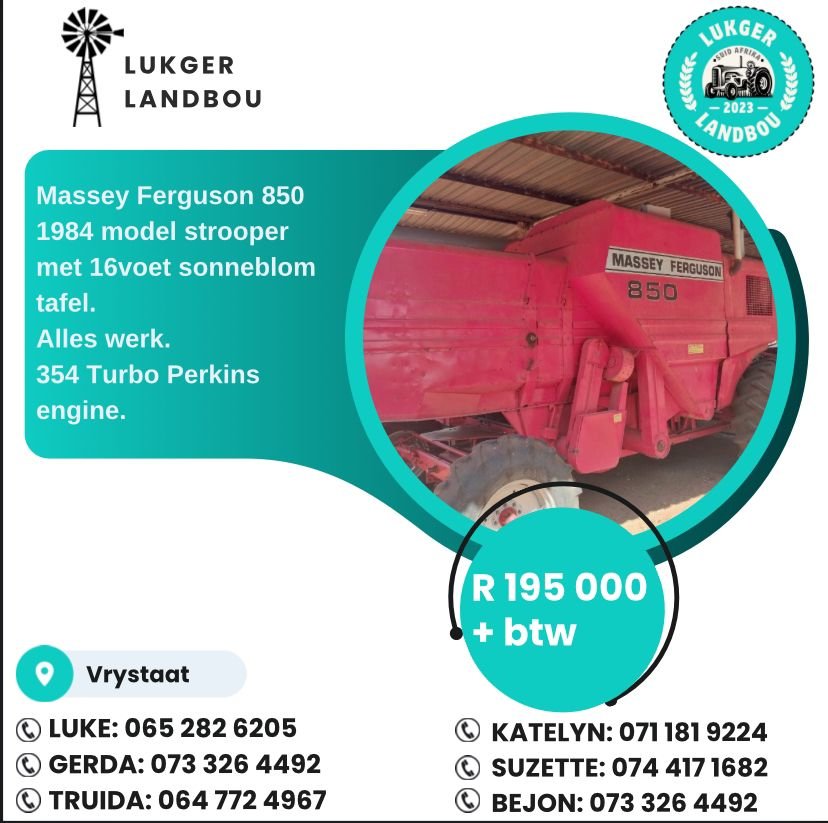 Massey Ferguson 850, 1984 model, stroper met 16 voet sonneblom tafel. Alles werk. 354 Turbo Perkins Engine. R195000.00 + vat. Vrystaat. Kontak Gerda 0733264492view more