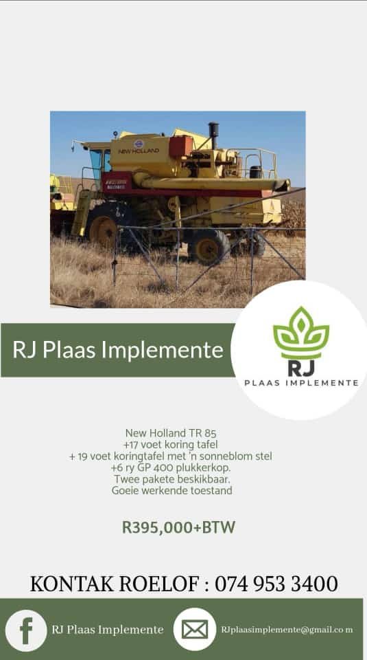 New Holland TR 85 + 17 voet koring tafel + 19 voet koringtafel met sonneblom stel + 6ry GP 400 Plukkerkop Twee Pakette beskikbaar Goeie werkende toestand R395 000 + BTW KONTAK ROELOF : [hidden information]