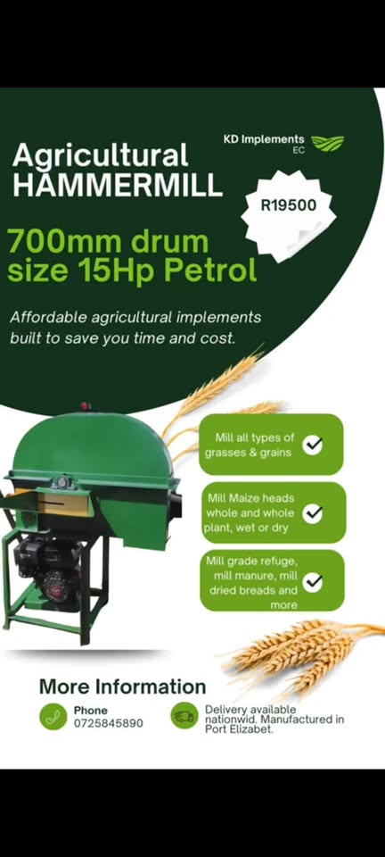 15HP Petrol Hammermill β 700mm Drum Size Includes: πΉ 10mm sieve & 25mm sieve (custom sieve sizes also available) Perfect for milling large quantities of: π± Grasses πΎ Grains π Dried leaves πΏ Small shrubs π½ Maize plants (whole, wet or dry, with heads) π Dried bread π© Manure β¦and much more! β Manufactured in Port Elizabeth β Delivery available nationwide π Contact: KD Implements EC β Affordable, reliable implements for South African farmers πΏπ¦π
