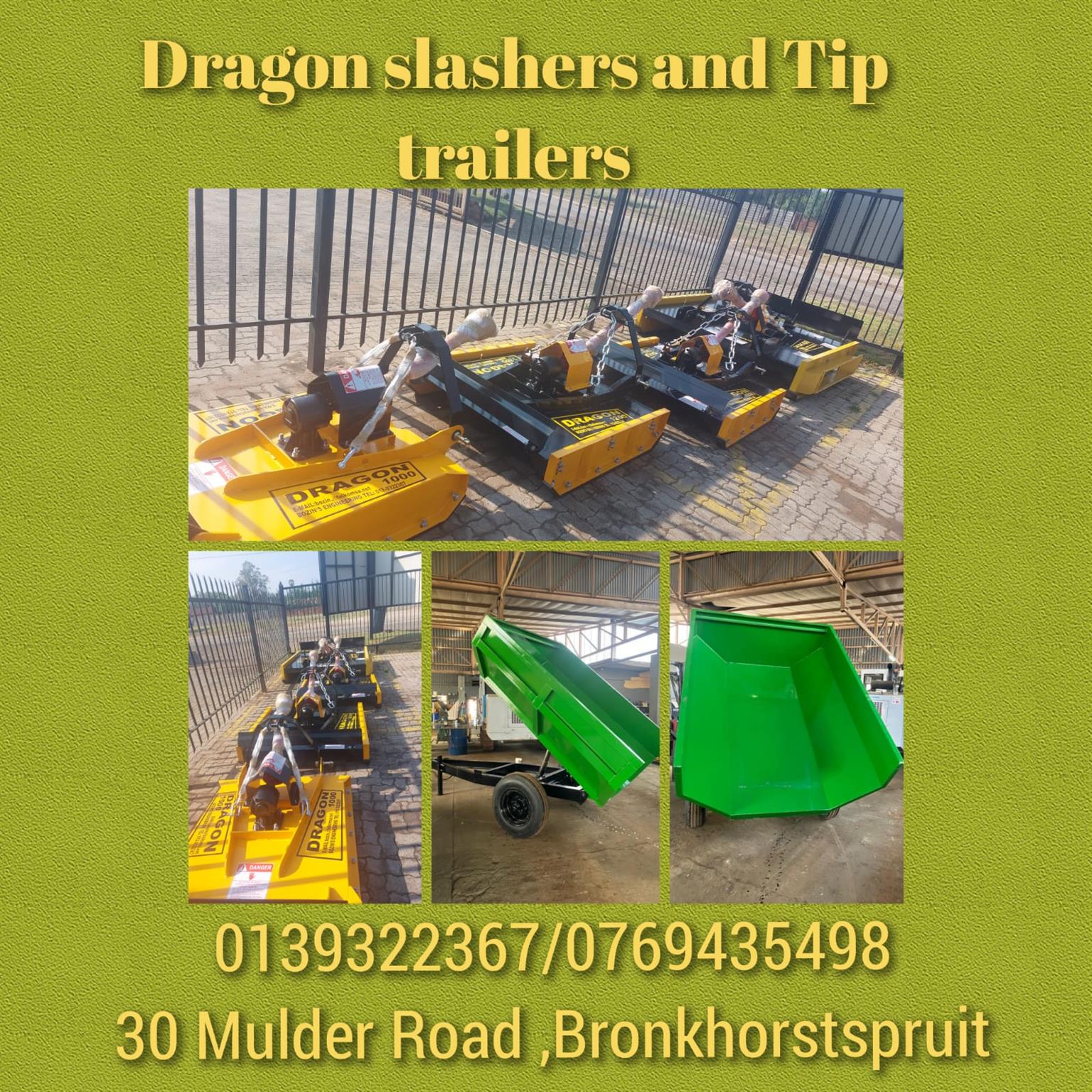 Dragon Slashers & Farming Equipment 013 93 22367 076 943 5498view more 013 93 23852 bozin.dragon@gmail.comview email... Www.dragonslashers.co.za Dragon Farming Equipment is a registered company within South Africa, with over 25 years of experience in the manufacturing industry. We specialize in producing high-quality Dragon Slashers, ranging from 1m to 4.5m. Our product range also includes blower mowers, tip trailers, dropside trailers, septic steel tanks, road brooms, hydraulic scrapers, and scraper graders. Additionally, we offer repair services for old farming equipment. Don't miss out on our November specials on Slashers and tip trailers. Contact us today. 013 93 23852 076 943 5498view more 013 93 22367 Dragon Slashers & Farming equipment