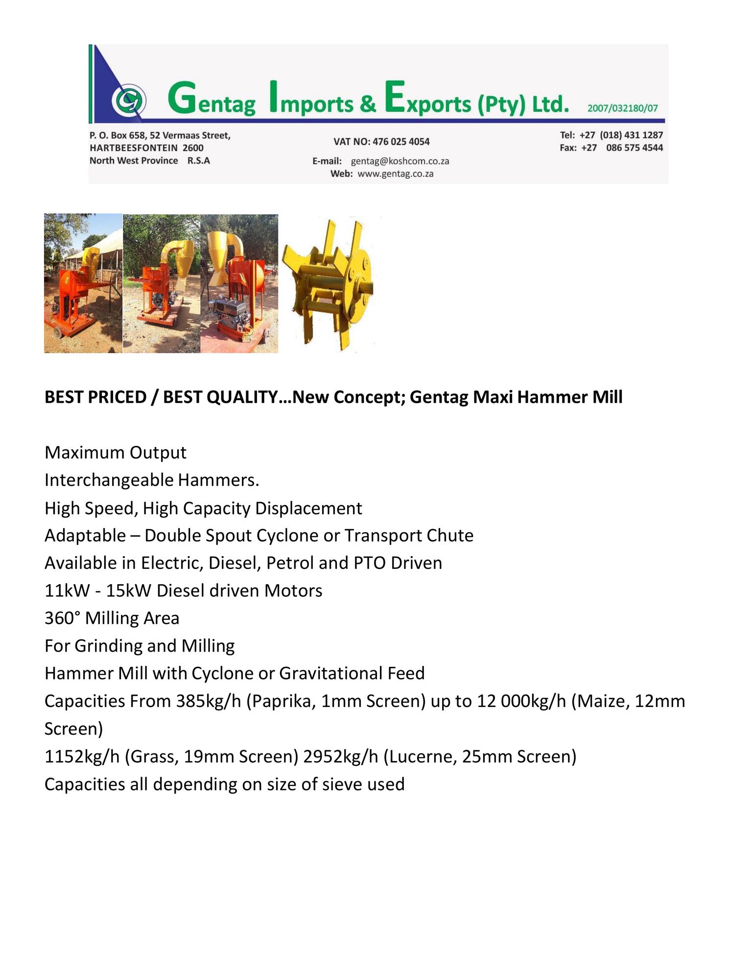 Capacities From 385kg/h (Paprika, 1mm Screen) up to 12 000kg/h (Maize, 12mm Screen)