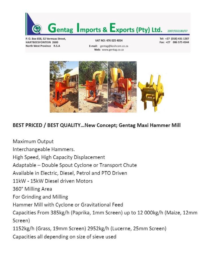 Capacities From 385kg/h (Paprika, 1mm Screen) up to 12 000kg/h (Maize, 12mm Screen)
