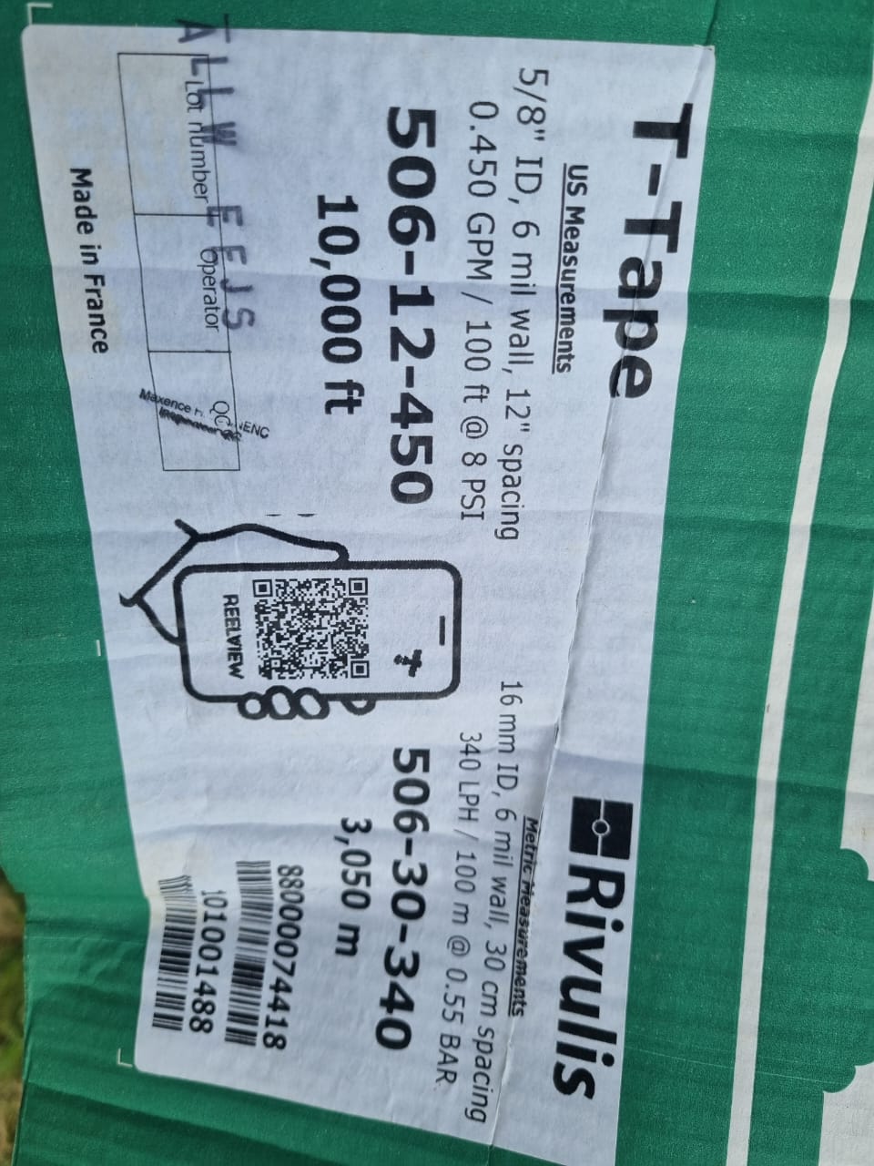 Rivillus irrigation drip lines 16mm diameter, 30cm spacing and 0.6mm wall thickness.