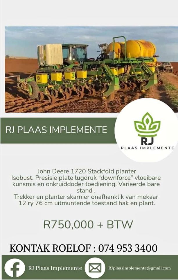 John Deere 1720 Stackfold planter Isobust, presisise plate, lugrdruk "downforce" vloeibare kunsmis en onkruiddoder toediening. Trekker en planter skanier onafhanklik van mekaar 12ry 76cm Uitmuntende toestand, Hak en plant R750 000 + BTW KONTAK ROELOF : [hidden information]