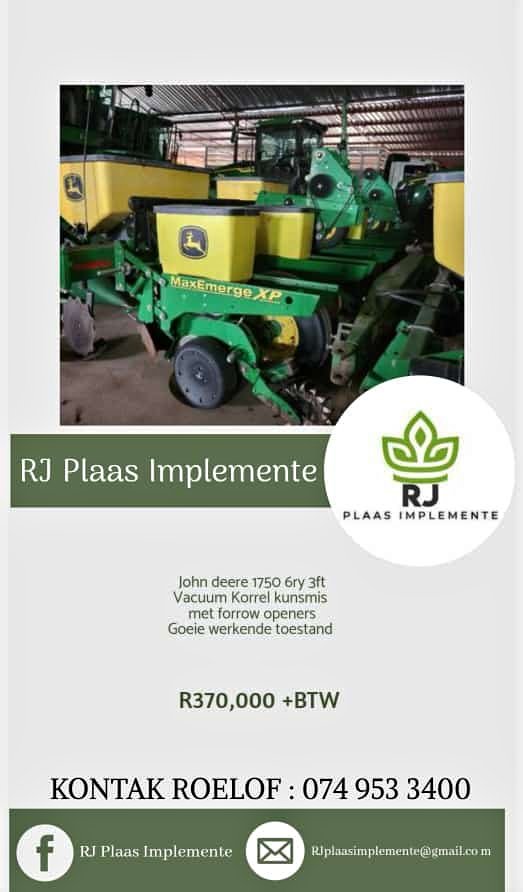 John Deere 1750 6ry 3ft Vacuum korrel kunsmis met forrow openers Goeie werkende toestand R370 000 + BTW KONTAK ROELOF :
