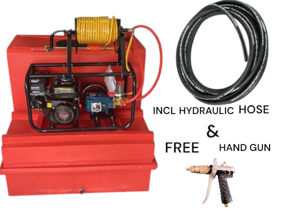 Also Includes 20m High Pressure hose on reel and spray lance, Swivel and Suction/ Return Hose, 60bar pressure ,18 to 28 L per min.