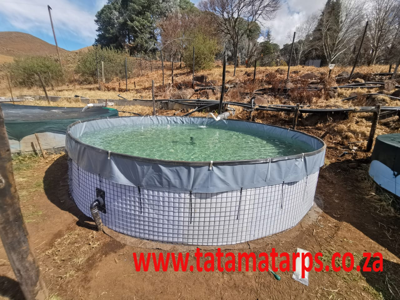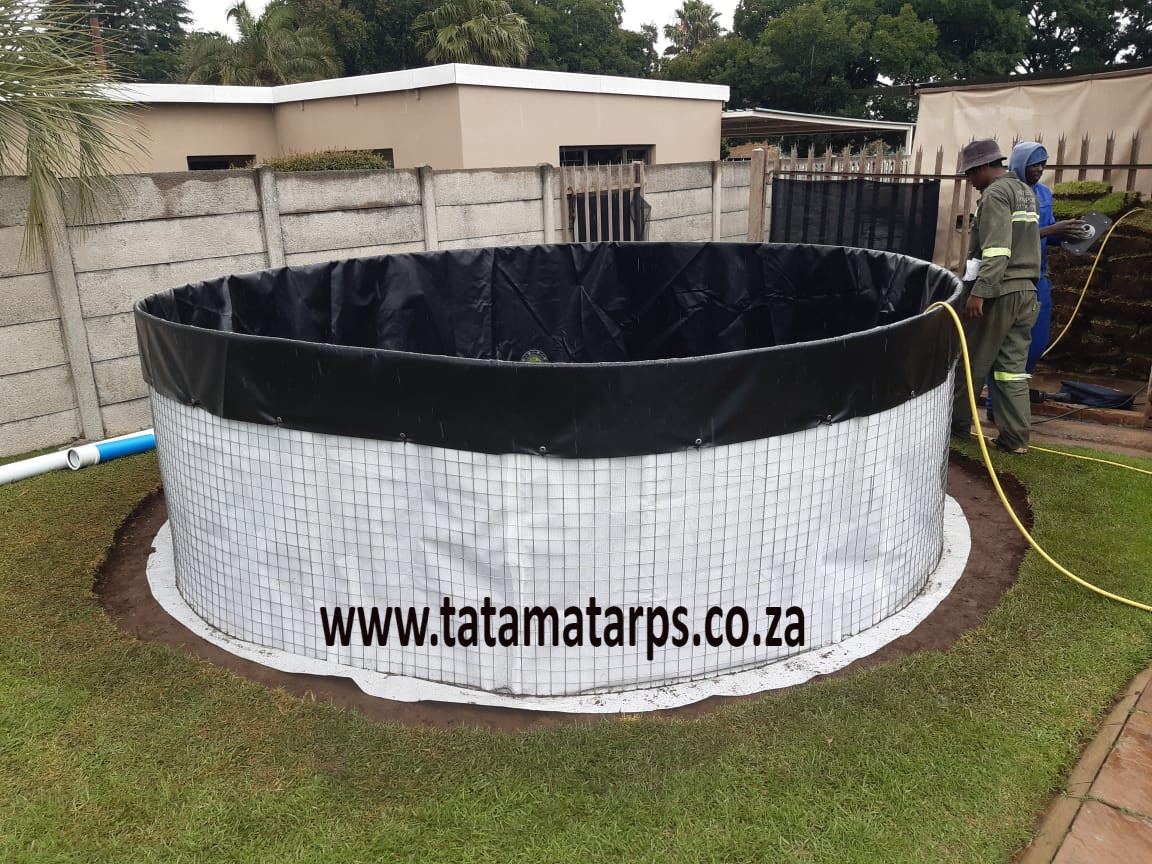 Welded Mesh Wall Reservoirs /dams /Maasdraad Damme - from 2m diameter x 1.1m deep (3400 litre) up to 9.45m diameter x 1.83m deep (128 000 litre). These dams are in Kit form and can be easily transported and DIY installed. Dams are ideal for Aquaculture / Fish farming of Tilapia, Koi, barbel and other fish as well as for irrigation. They are manufactured with Virgin or recycled reinforced PVC liner options, making us the most cost-effective mesh reservoir manufacturer in South Africa. www.tatamatarps.co.za
