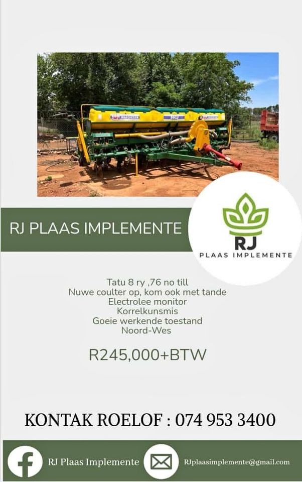 Tatu 8ry 76 no till Nuwe coulter op, kom ook met tande Electrolee monitor Korrelkunsmis Goeie werkende toestand Noord-Wes R245 000 + BTW