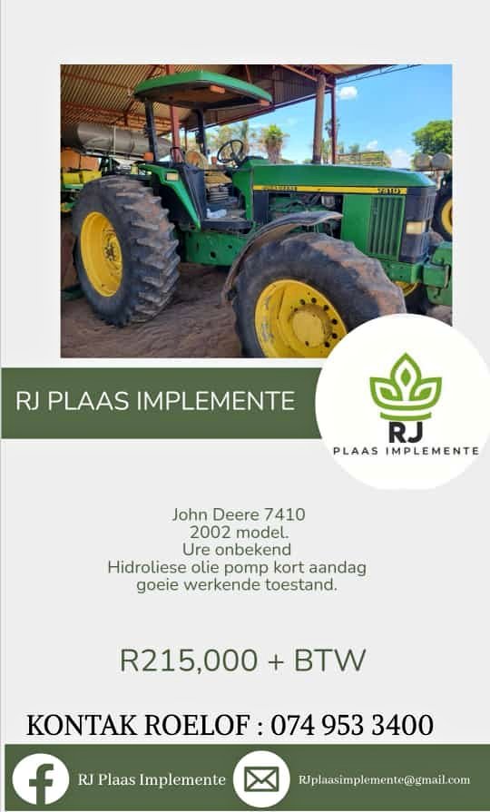 John Deere 7410 2002 model ure onbekend Hidroliese olie pomp kort aandag Goeie werkende toestand R215 000 + BTW KONTAK ROELOF :
