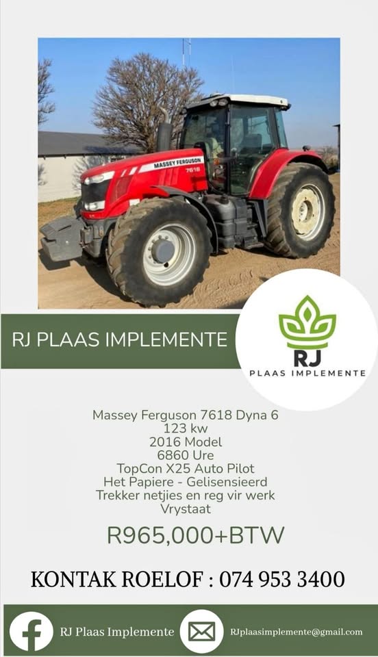 Massey Ferguson 7618 Dyna 6 123kw 2016 model 6860 ure TopCon x25 Auto pilot Het papiere - Gelisensieerd Trekker is netjies en reg vir werk Vrystaat R965 000 + BTW KONTAK ROELOF :