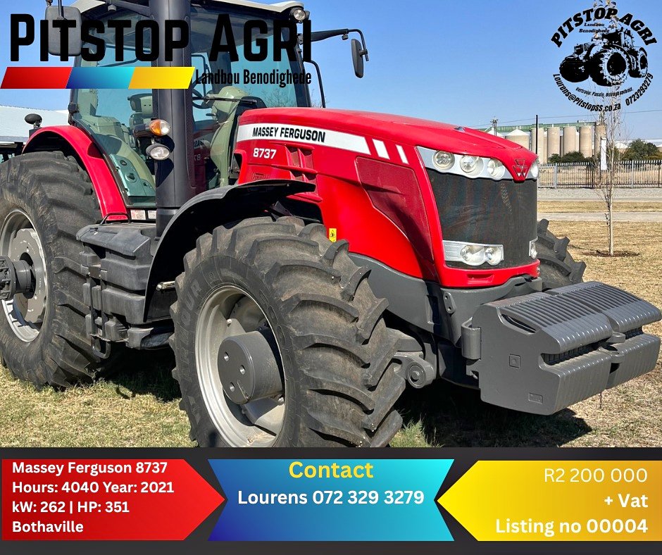 Looking for a powerful and reliable tractor to boost your farm’s productivity? This Massey Ferguson 8737 is in excellent condition and ready to go straight to work! ✅ Details: Model: Massey Ferguson 8737 Year: 2021 Hours: 4040 Power: 351 HP / 262 kW Location: Bothaville Condition: Excellent – well maintained 💰 Price: R2,200,000 + VAT 📞 Contact: Lourens – 🏷️ Listing No: 00004