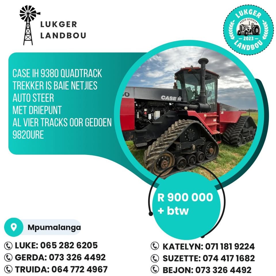 Case IH 9380 Quadtrack, Trekker is baie netjies, Auto steer, met drie punt, Al vier tracks oorgedoen. 9820 ure. R900000.00 + vat. Mpumalanga. Kontak Gerda 0733264492view more