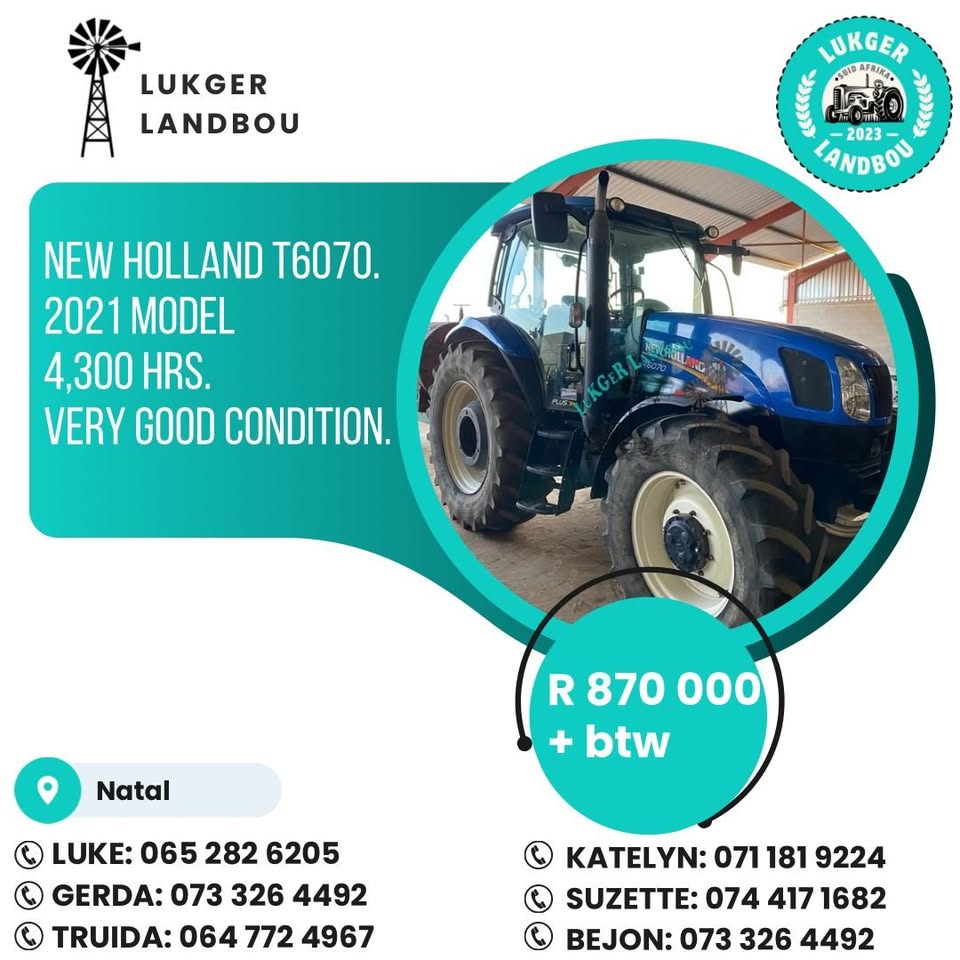 New Holland T6070, 2021 model, 4300 ure, Baie goeie toestand. R870000.00 + vat. Natal. Kontak Gerda 0733264492view more
