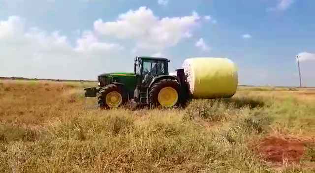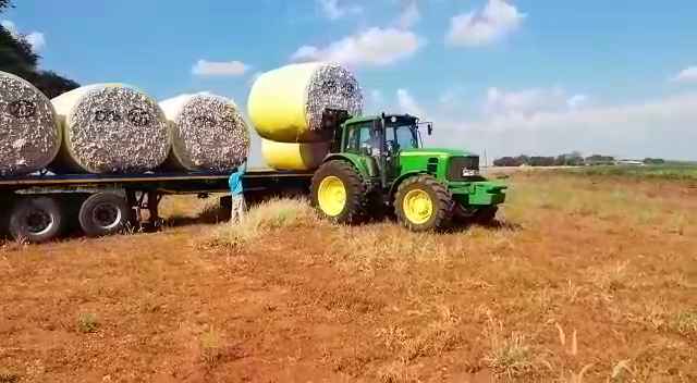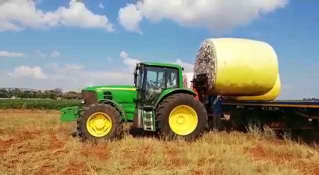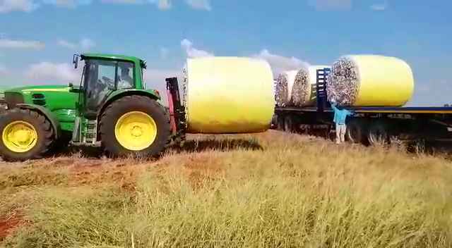 Laai 'n 2.5 ton katoenbaal met 'n 90 kw Trekker. Load a 2.5 tonne cotton bale with a 90 kw tractor.
