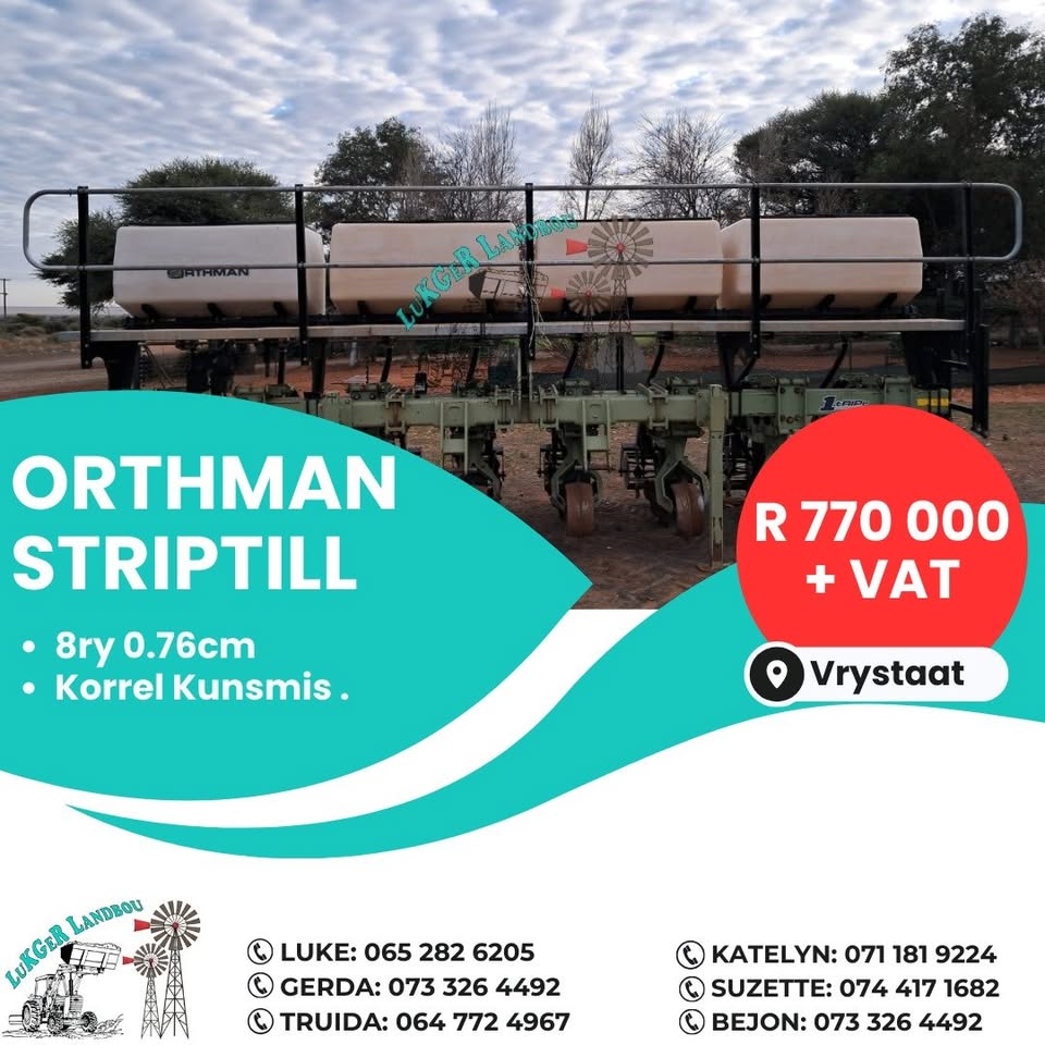 Orthman Stiptill, 8 ry 0.76cm, Korrrel kunsmis, R770000.00 + vat. Vrystaat, Kontak Gerda 0733264492view more