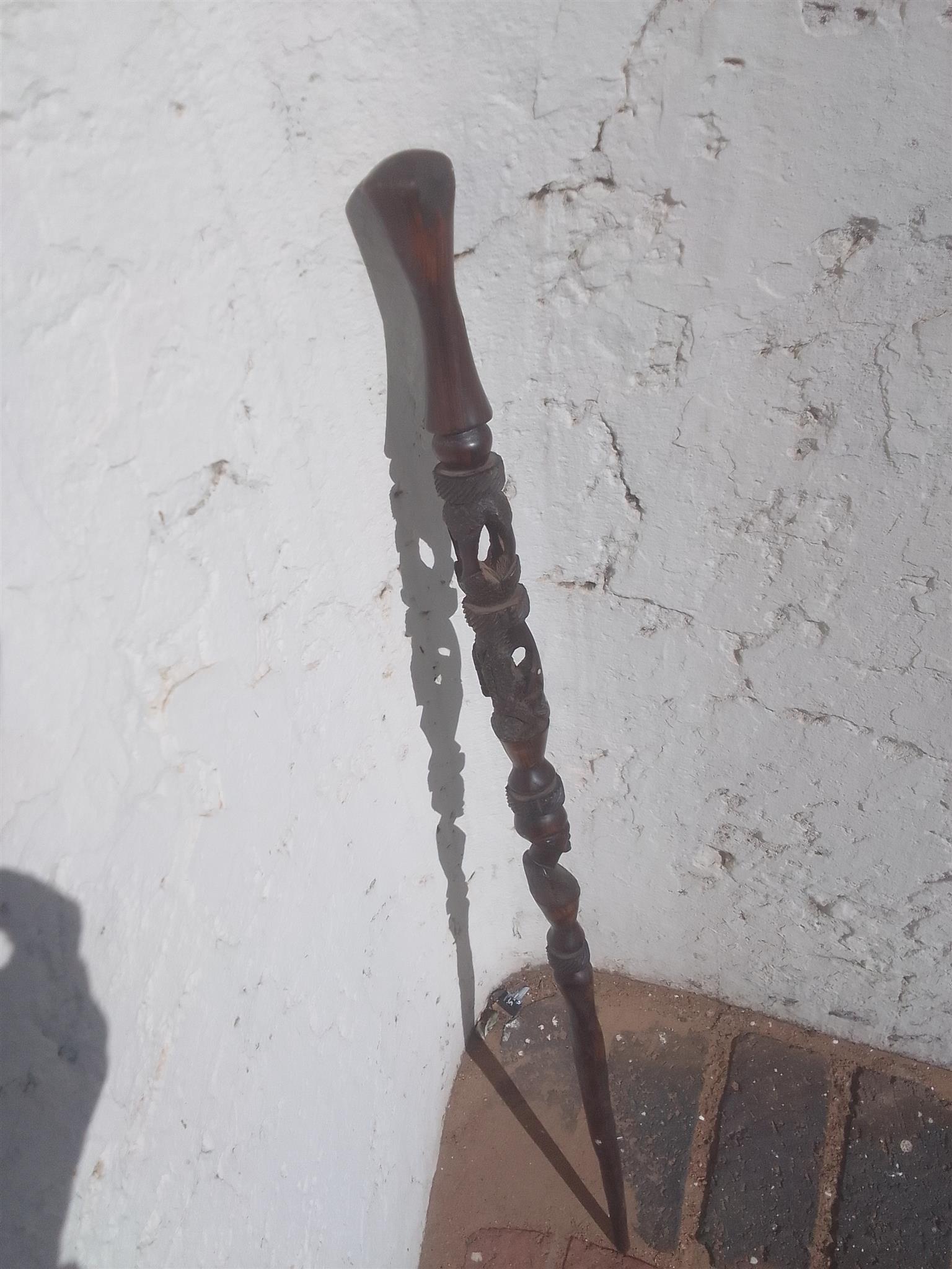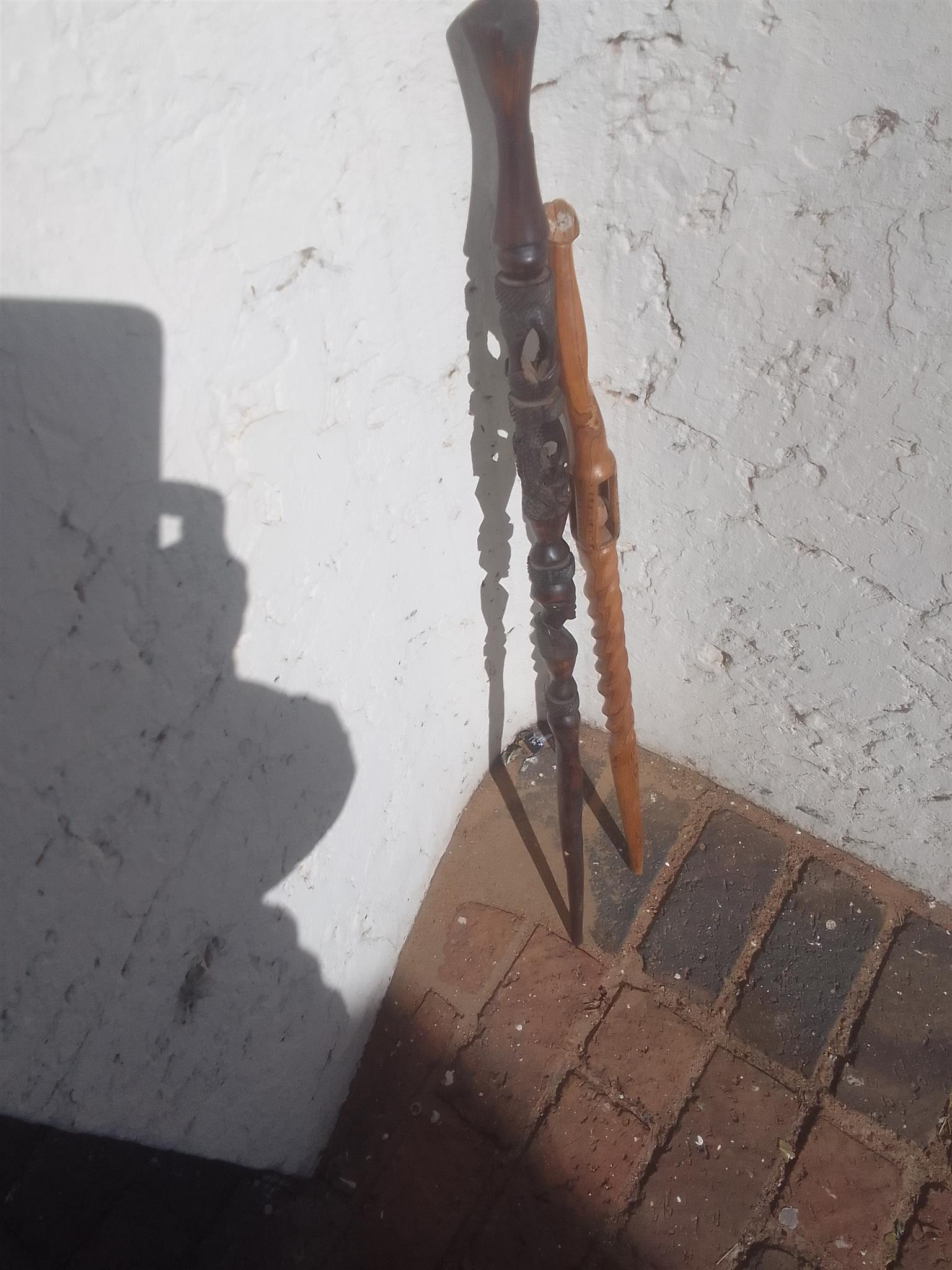 Hand carved walking sticks x two. One ebony in good condition and the other a unknown wood with slight damage on the handle r400 for the pair.