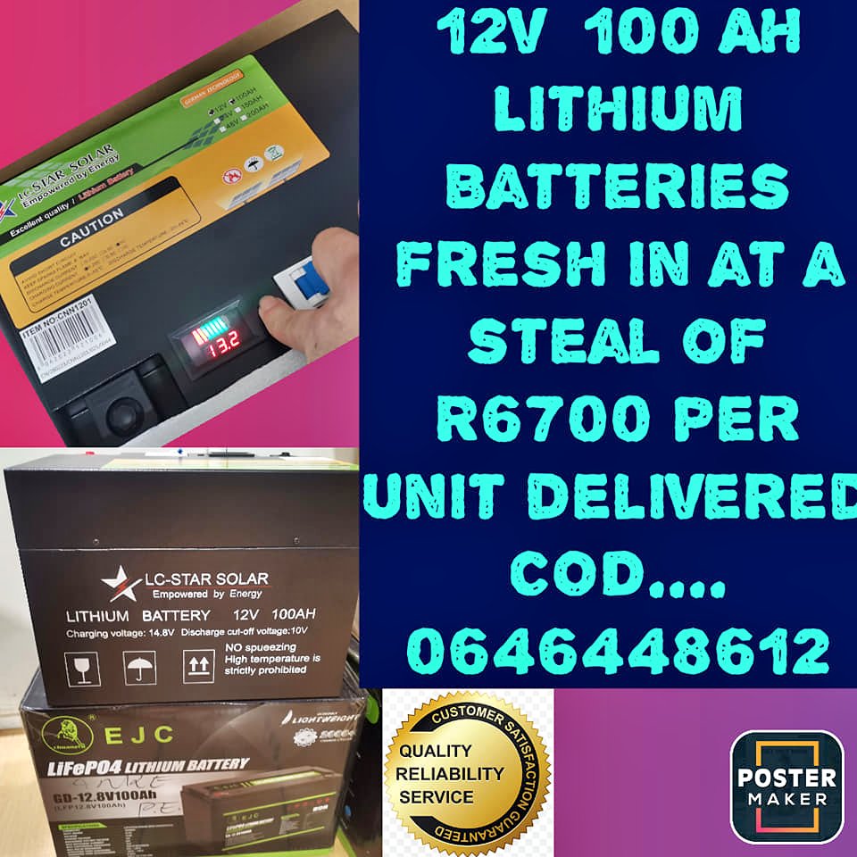 12v 100 AH Lithium Batteries fresh in at a steal of R6700 per unit delivered COD....