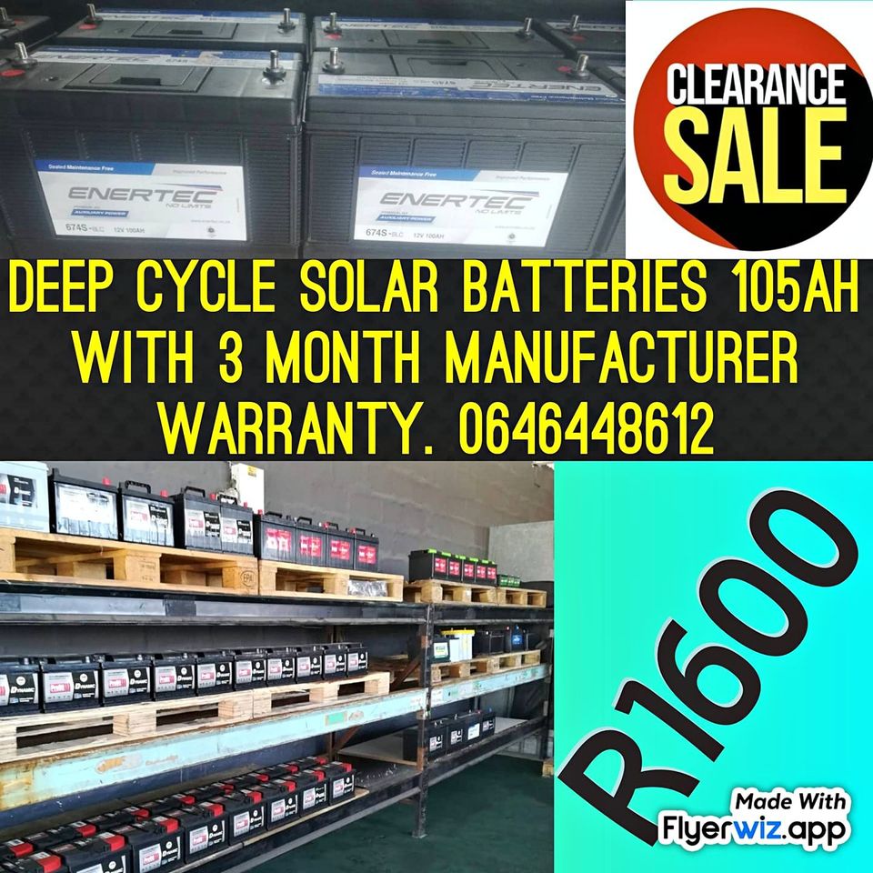 We have a range of deep cycle batteries with a 3 month manufacturer warranty and load tested on delivery. 105ah Lead Acid R1600 100ah Gel or AGM R1700 150ah lead acid R2400 200ah Gel R3600 250ah Gel R4000 Please feel free to call or wattsapp us on [hidden information].