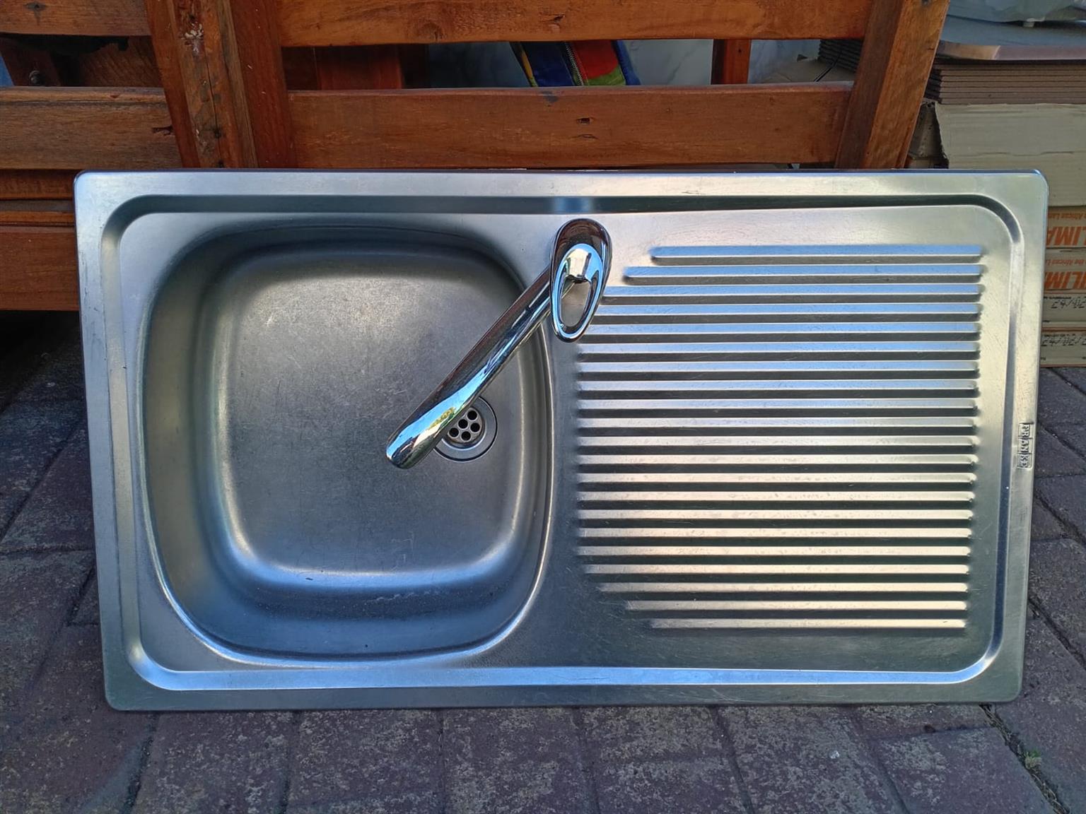 Single kitchen basin including warm and cold water mixer plus down pipes.