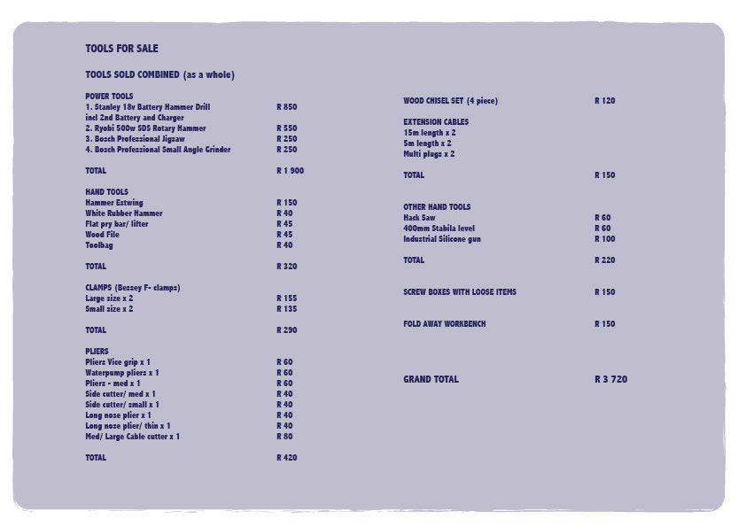 POWER AND HAND TOOLS FOR SALEAs per added list and pictures on addActual Value - R 10 000Special Offer - R 3 720