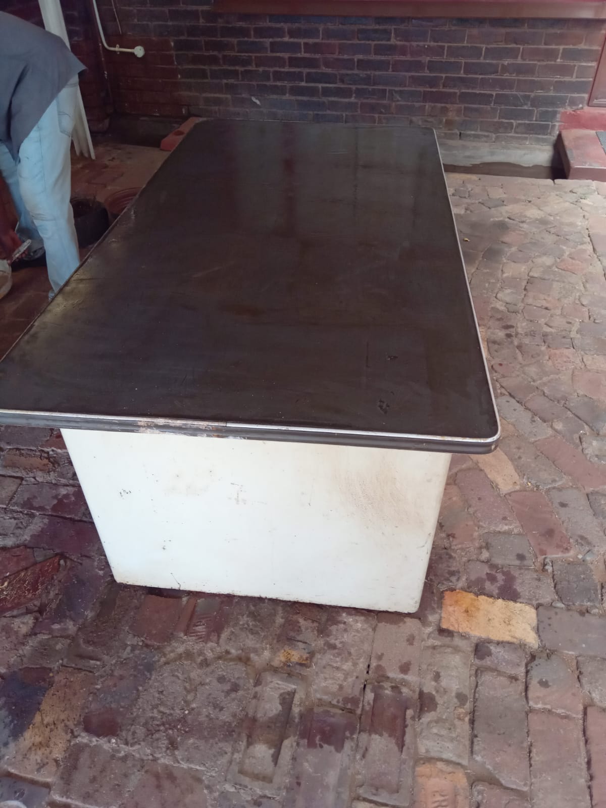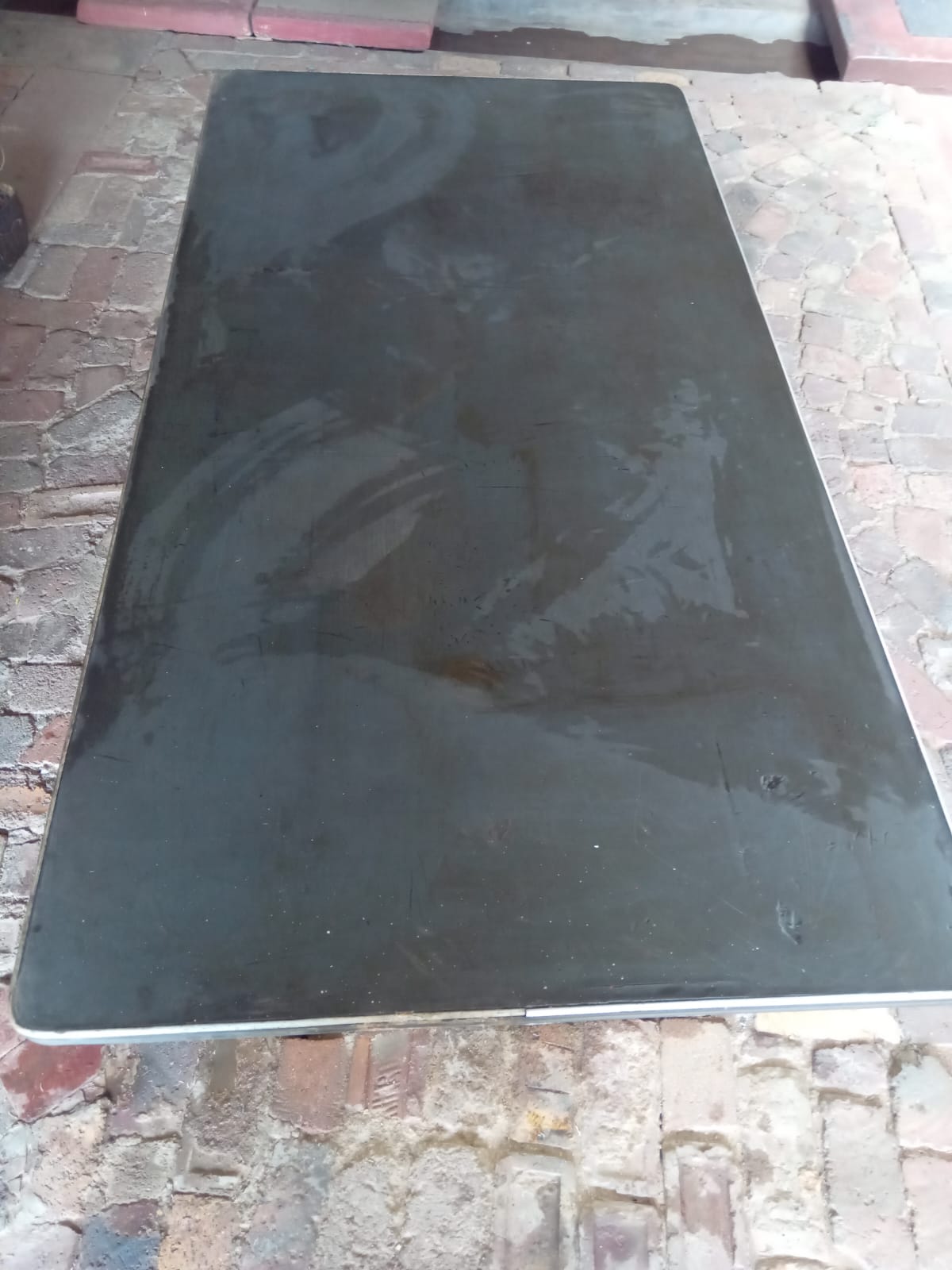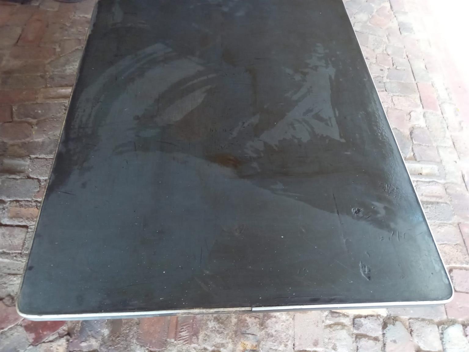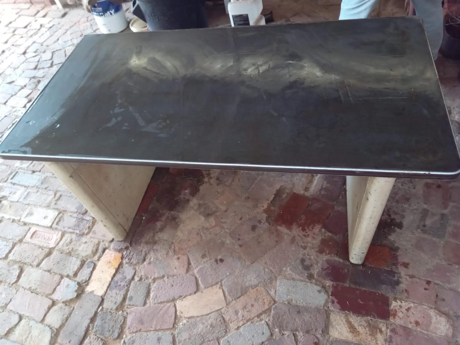 The table is in very good condition.It has Two Solid steel Legs for strong support.A rubber top surface so that items can not get scratched or damaged.