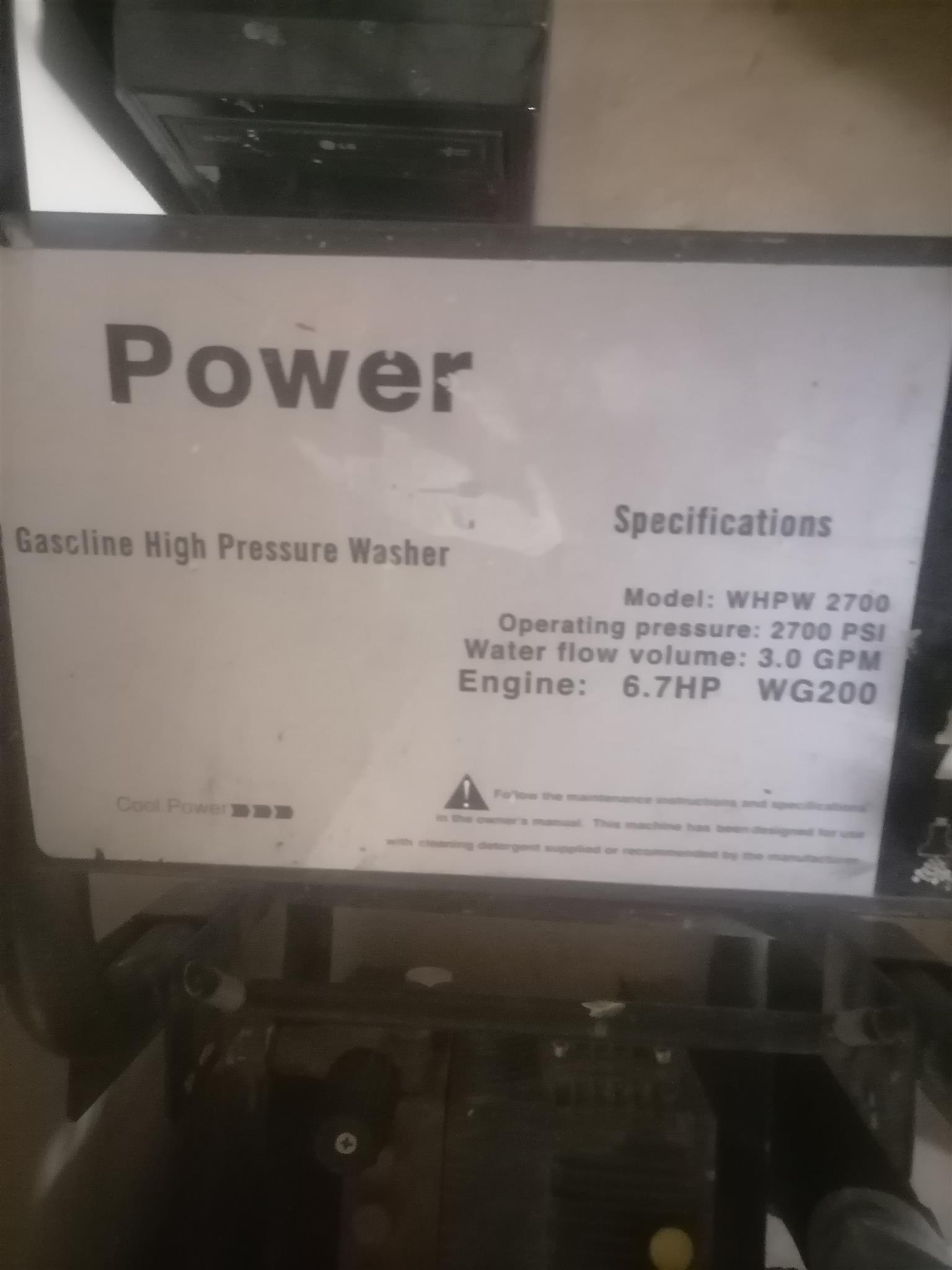 Petrol high pressure washer. More details: