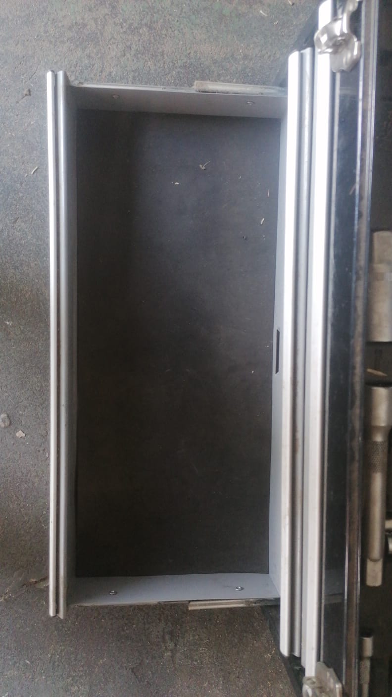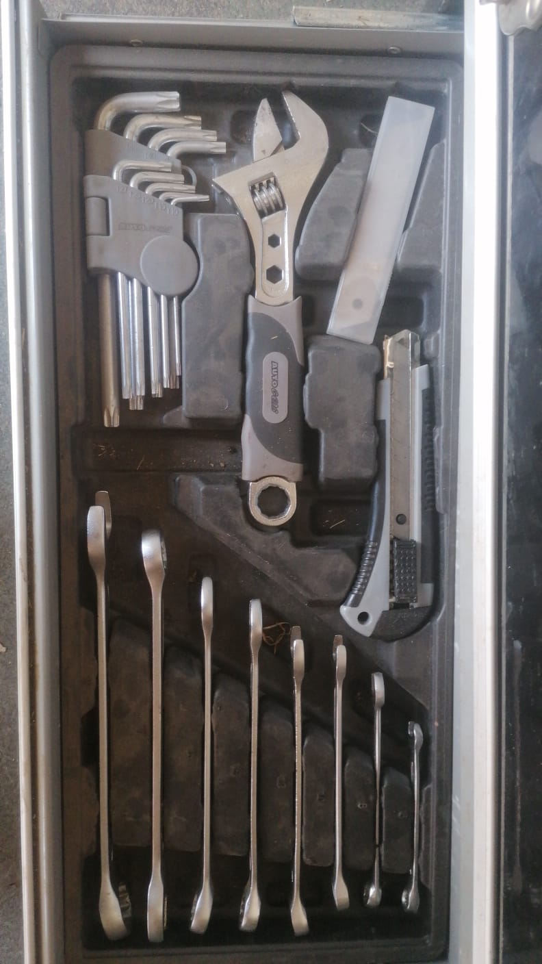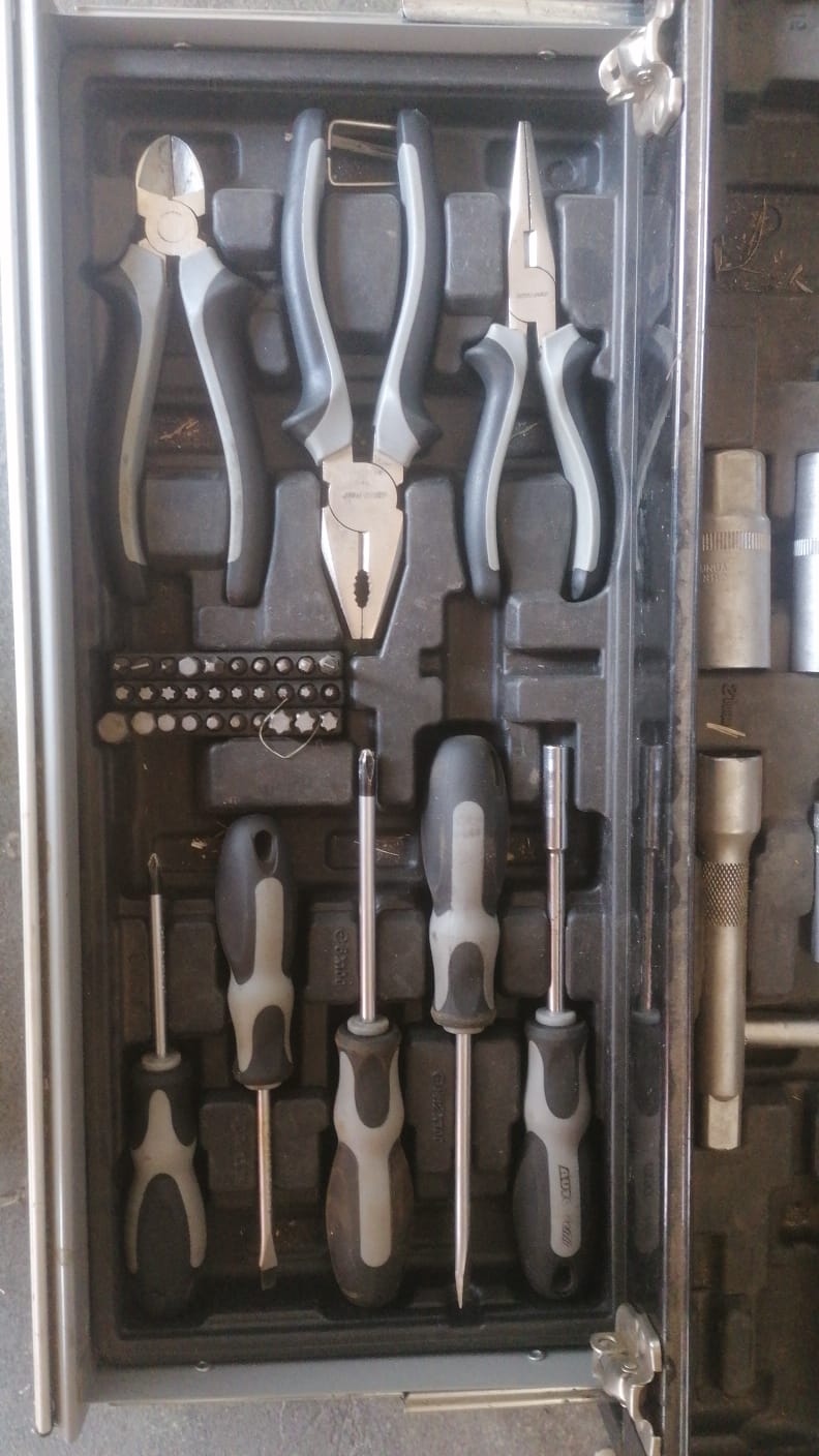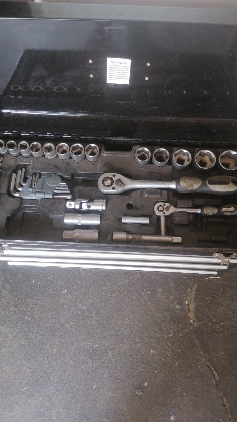 Black multi-layered toolbox complete with tools. Great condition
