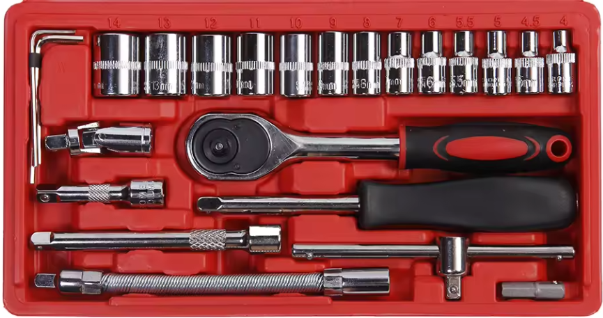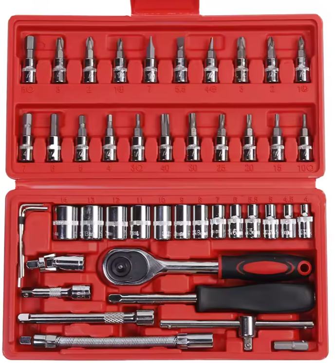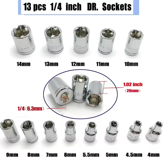 46 Piece socket set. Brand new. Includes the following tools: 13pcs 1/4 inches DR sockets: 4, 4.5, 5, 5.5, 6, 7, 8, 9, 10, 11, 12, 13, 14mm