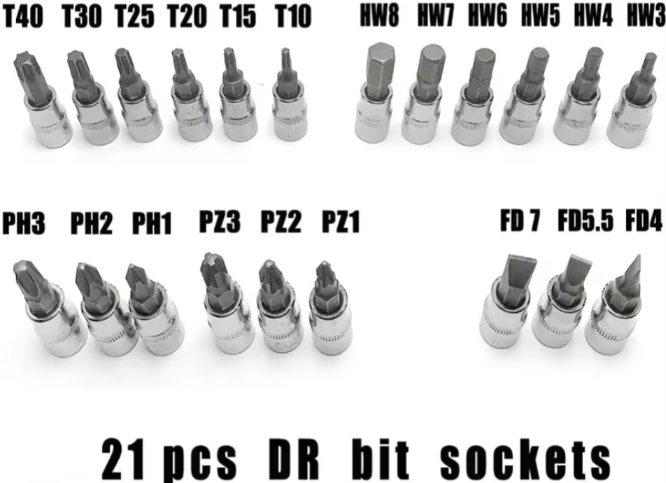 21pcs DR bit sockets: PH 1, 2, 3, PZ 1, 2, 3; FD 4, 5.5, 7; HW 3, 4 , 5, 6 , 7, 8; T 10, 15, 20 , 25, 30, 40
