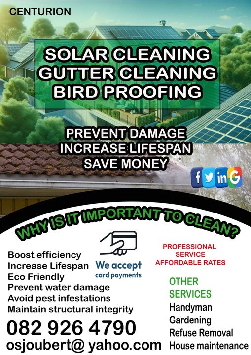 Solar cleaning and maintenance.Garden services.Moving.Handyman.+27 82 926 4790view more