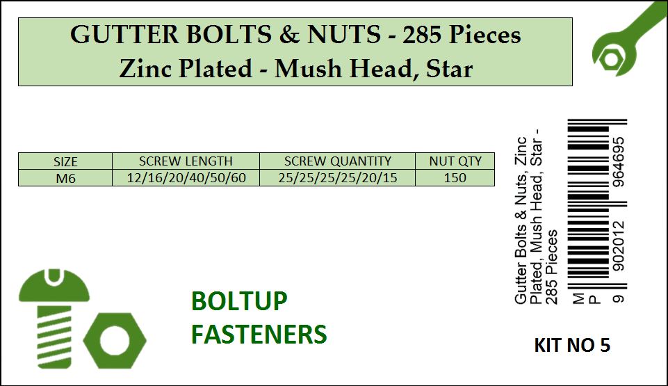 GUTTER BOLTS & NUTS, Zinc Plated, Mush Head, Star - 285 Pieces.