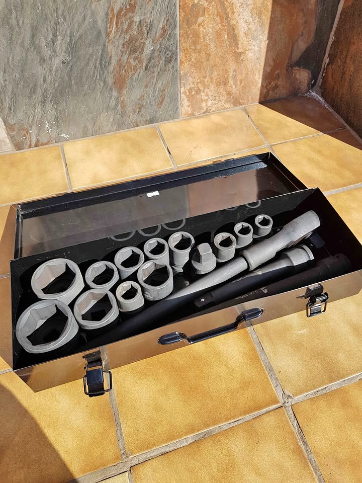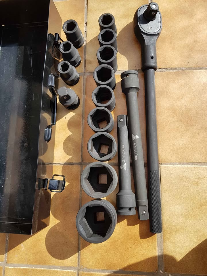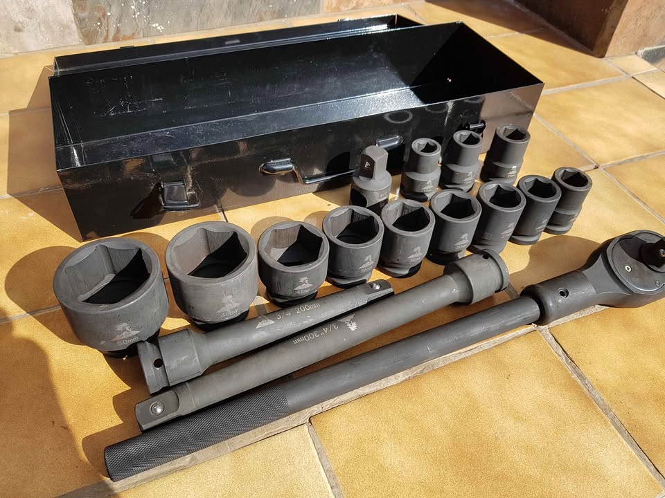 BRAND NEW IN THE BOX JJS-OSAKA 3/4"DR.IMPACT SOCKET SET. THE SOCKET SIZES IS AS FOLLO. 17/19/21/24/27/30/32/36/41/46 AND 50 MM. 1 SLIDING T-BAR:3/4"DR. 1 RATCHET HANDLE:3/4"DR. AND A EXTENSION BAR 200 MM AND A 300 MM .. THIS SET IS MADE OF CHROME MOLLY STEEL.