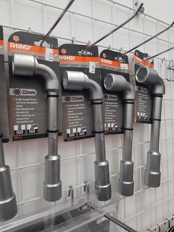 BRAND NEW ANGLED SOCKET WRENCH. ITS FULLY FORGED FROM CHROME VANADIUM STEEL. HARDEND AND TEMPERD. IT'S IDEAL FOR WORKING ON STUDS AND THREADED ROD. THE SIZES AND PRICES IS AS FOLLO. 6MM R 20 7MM R 25 8MM R 25 9MM R 30 10MM R 30 11MM R 30 12MM R 30 13MM R 35 14MM R 40 15MM R 40 16mm R 45 17MM R 60 18MM R 60 19MM R 70 20MM R 95 21MM R 100 22MM R 110 23MM R 120 24MM R 130 27MM R 165 IT'S A VERY HANDY TOOL SET TO HAVE AROUND THE HOUSE OR AT THE WORK PLACE.