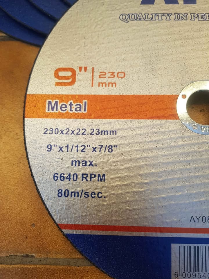 ⚙️ 230x2x22.23mm Metal Cutting Discs – Power Through Metal with Ease! Get clean, precise cuts every time! These high-performance metal cutting discs are built for durability and efficiency, making them perfect for heavy-duty cutting jobs. ✅ Size: 230mm diameter × 2mm thickness × 22.23mm bore ✅ Material: Designed for steel & metal ✅ Fast, smooth cutting with minimal burr ✅ Long-lasting performance for professional or DIY use Ideal for workshops, construction, fabrication, and maintenance work. Cut faster. Cut cleaner. Cut smarter! 📞 Contact us today to order in bulk and save!