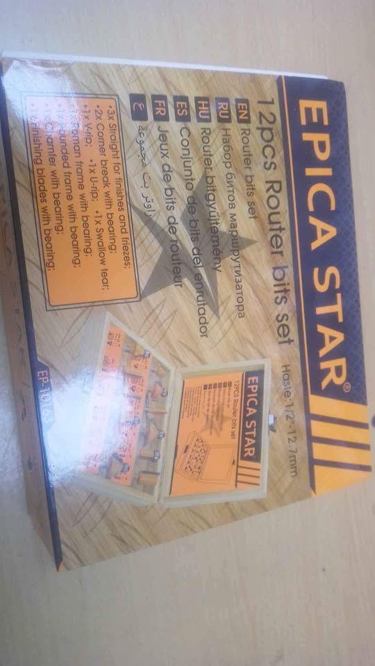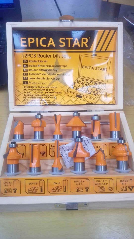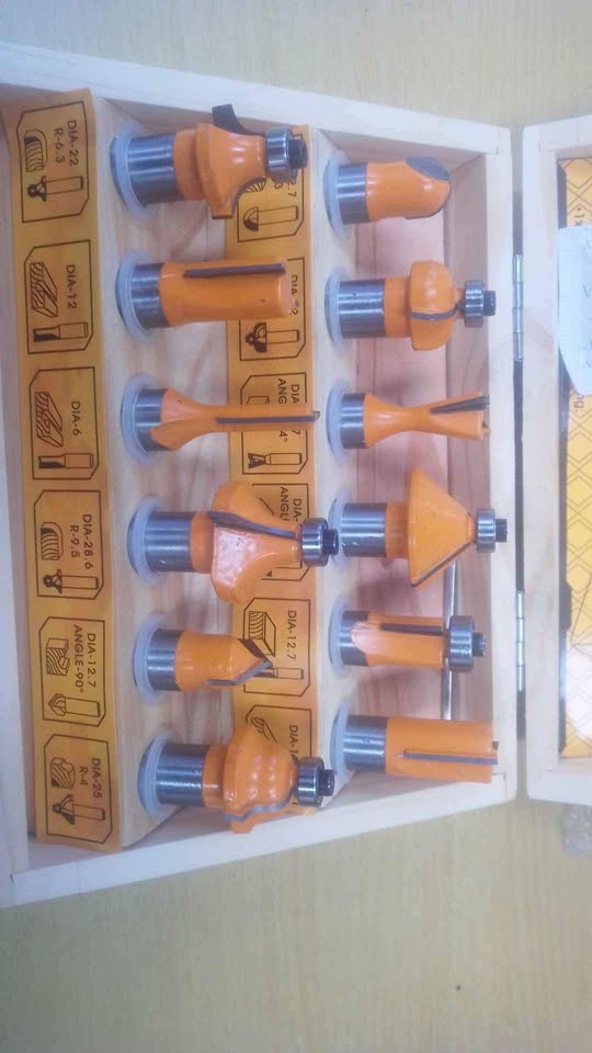 13pcs Router bits: 1/2" -12.7mm 3x straight for finishes and friezes 2x corner break with bearing 1x v-rip ; 1x u-rip , 1x swallow tear 1x roman frame with bearing 1x rounded frame with bearing 1x chamfer with bearing 1x finishing blades with bearing