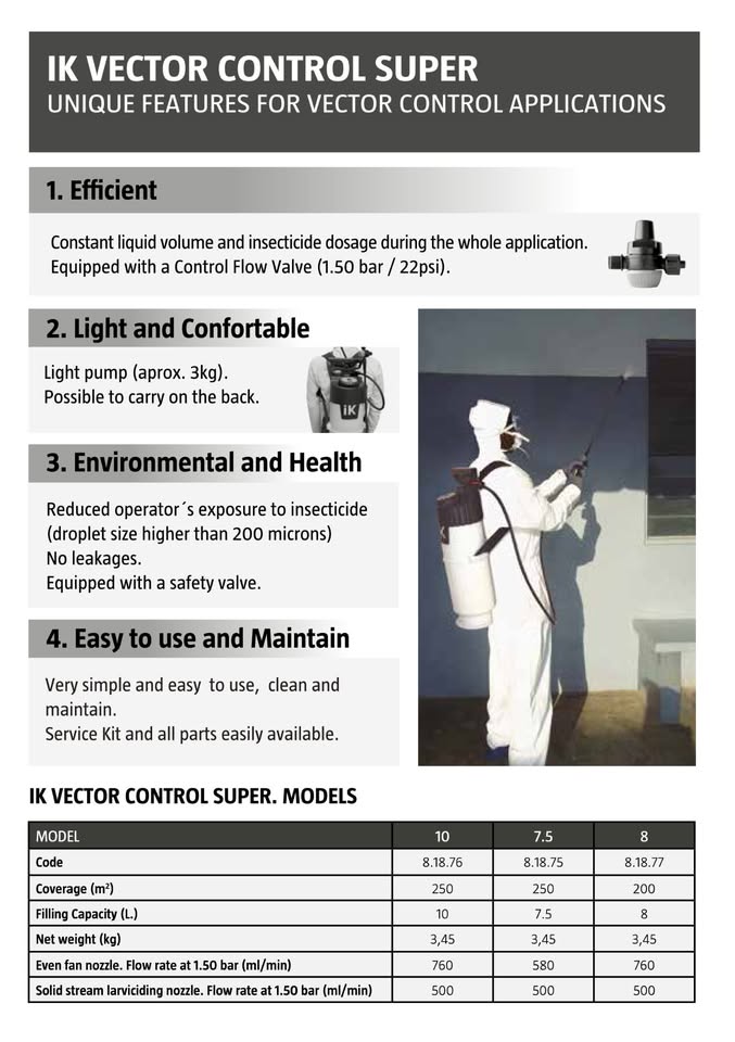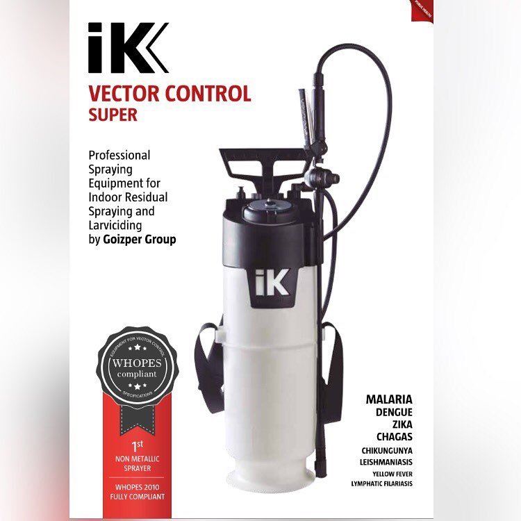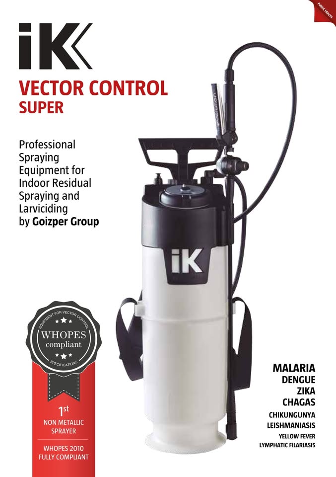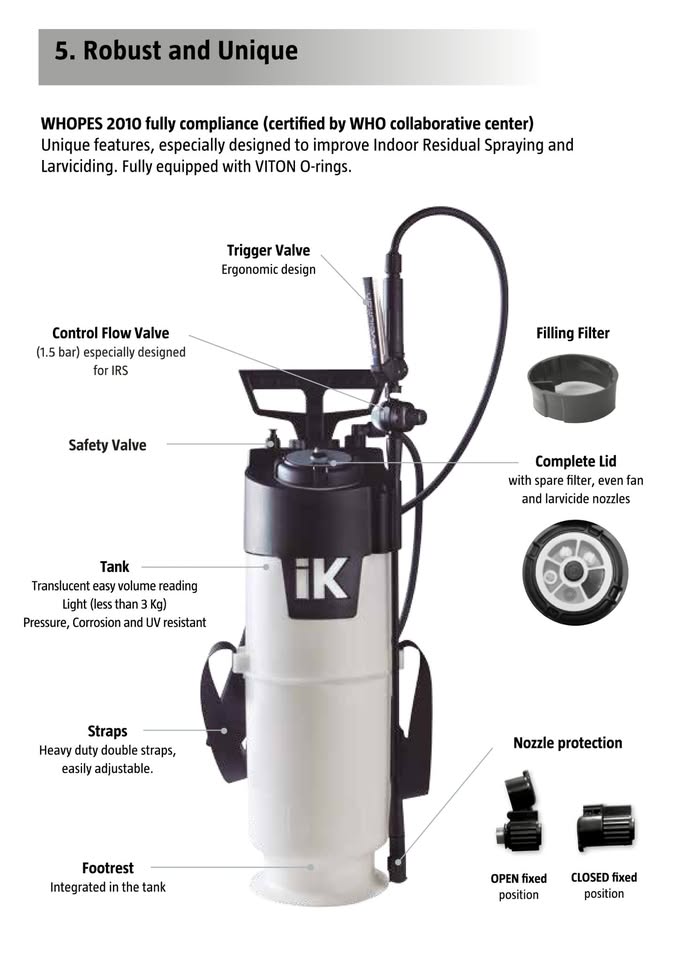 - Efficient: Constant liquid volume and insecticide dosage during the whole application. Equipped with a Control Flow Valv (1.50 bar / 22psi) - Light and confortable: Light pump (aprox. 3kg). Possible to carry on the back - Enviromental and health: Reduced operator“s exposure to insecticide (droplet size higher than 200 microns). No leakages. Equipped with a safety valve - Easy to use and maintain: Very simple and easy to use, clean and maintain. Service Kit and all parts easily available. - Robust and unique: WHOPES 2010 fully compliance (certified by WHO collaborative center) Unique features, especially designed to improve Indoor Residual Spraying and Larviciding. Fully equipped with VITON O-rings.