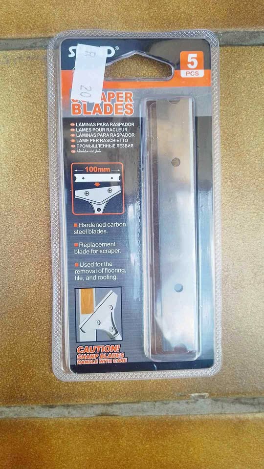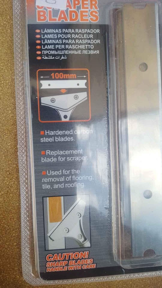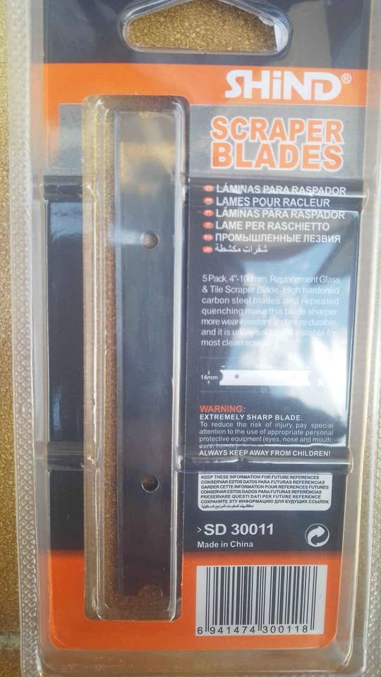 .HARDEND CARBON STEEL BLADES .REPLACEMENT BLADE FOR SCRAPER .USED FOR THE REMOVAL OF FLOORING.TILE AND ROOFING 5 PACK ,4"-100MM, REPLACEMENT GLASS & TILE SCRAPER BLADE . HIGH HARDENED CARBON STEEL BLADES AND REPEATED QUENCHING MAKE THIS BLADE SHARPER MORE WEAR -RESISTANT AND MORE DURABLE AND IT IS UNIVERSAL FOR IT IS SUITABLE FOR MOST CLEAN SCRAPERS