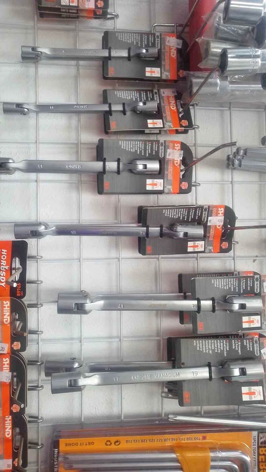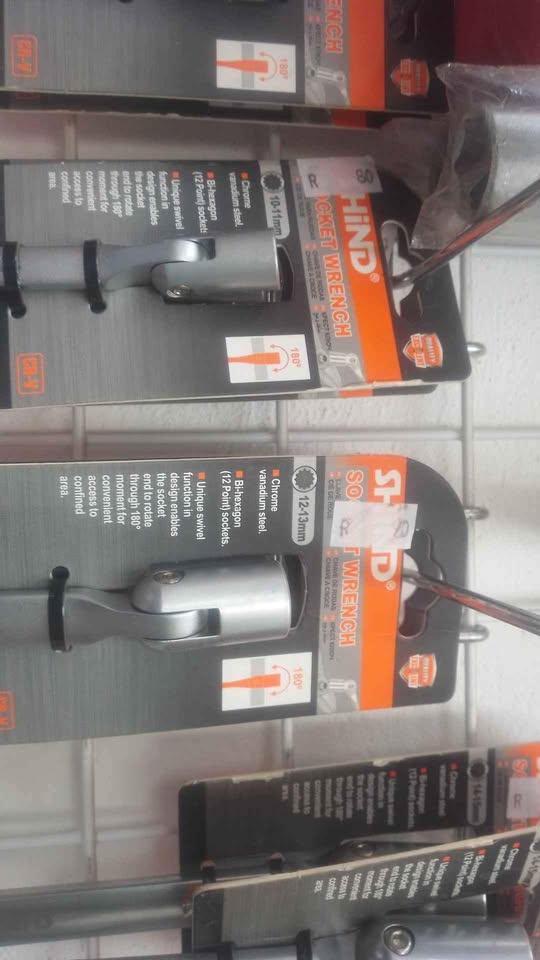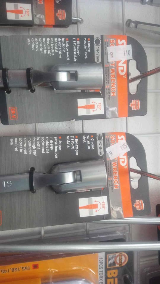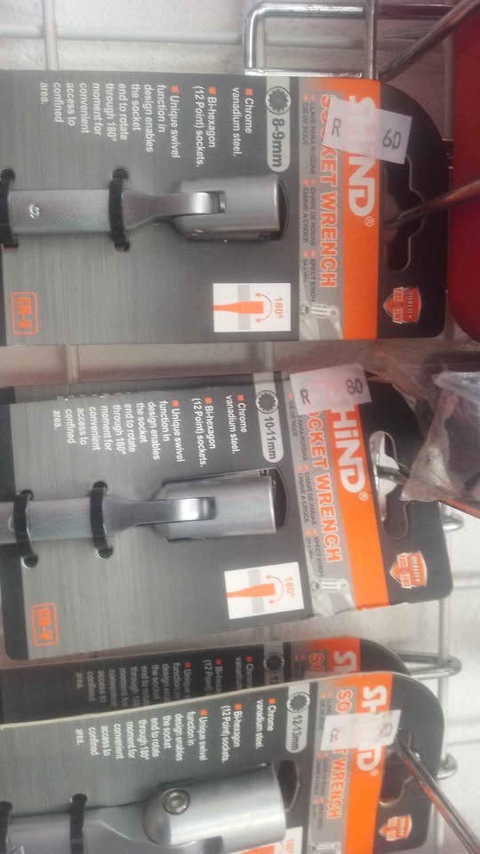 individual spanner sets 17-19MM SOCKET WREMCH = R115 14- 17 MM SOCKET WRENCH =R110 14-15 MM SOCKET WRENCH =R100 12-13 MM SOCKET WRENCH =R90 10-11MM SOCKET WRENCH =R80 8-9 MM SOCKET WRENCH =R60 . Chrome vanaduim steel .BI - HEXAGON (12 POINT) SOCKET . UNIQUE SWIVEL FUNCTION IN DESIGN ENABLES THE SOCKET END TO ROTATE 180° MOVEMENT FOR CONVIENT ACCESS TO CONFINED AREA. ITS A VERY HANDY TOOL TO HAVE AROUND THE HOUSE AND WORKSHOP