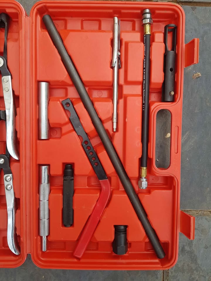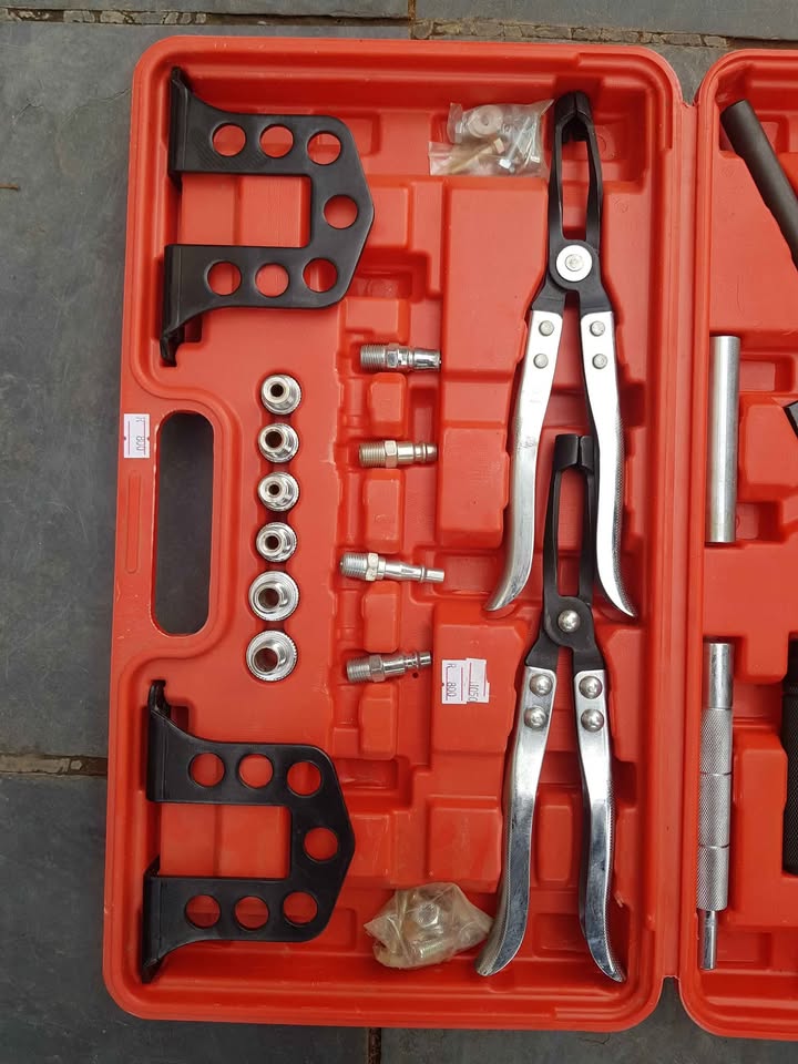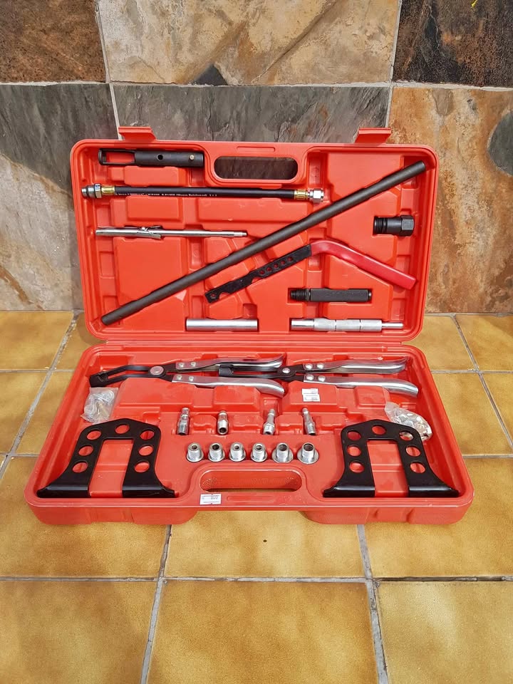 Completes service tool kit for installation and remove the valve spring without removing the cylinder head from the engine. Applicable for OHV & OHC petrol or diesel engines on Audi, Nissan, Toyota, Chrysler, Honda, Mazda, Mitsubishi, Porsche, Valve, VW, etc. Professional Cylinder Head Service Kit Complete upper engine service kit enables in situ removal and replacement of worn valve springs and guides/bushings. Suitable for 8, 16 and 24 valve engines. Universal valve spring compressor. Valve collet replacement tool.. Valve stem seal pliers long/straight. Valve stem seal pliers long/angled.. Rigid and flexible air/cylinder hoses. Valve stem seal replacement kit (5, 6, 7, 8, 10, 11.5mm). It's a very handy set to have around the house or at the work place..