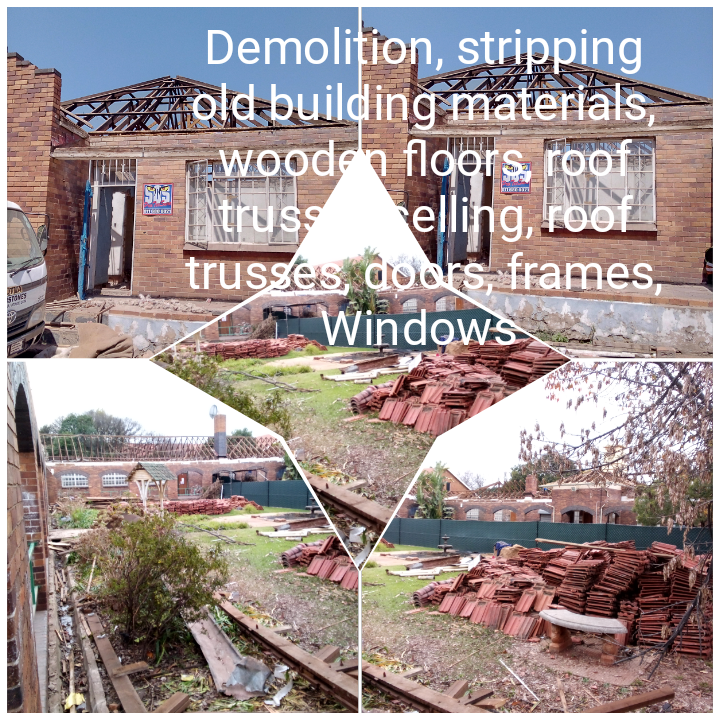 Demolition, ruble removal and sites clearence.we also strip and remove any old wooden floors, roof trusses, roof sheets, cellings, doors, frames, windows.