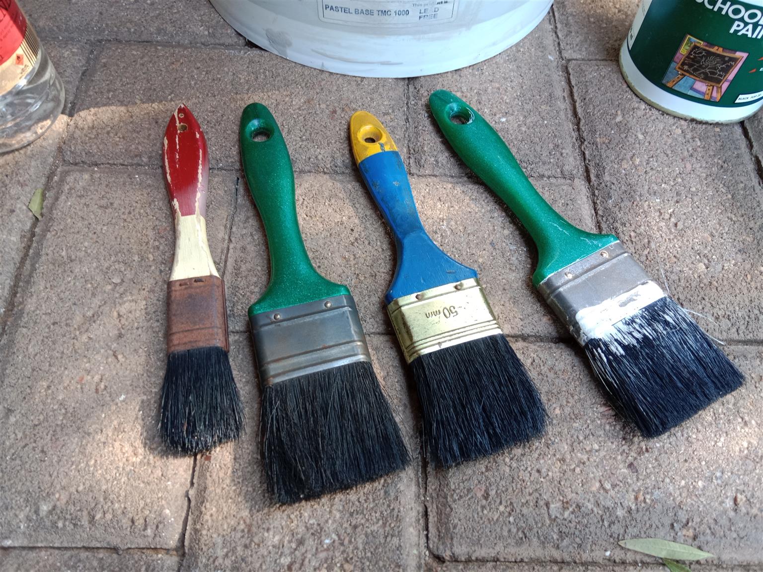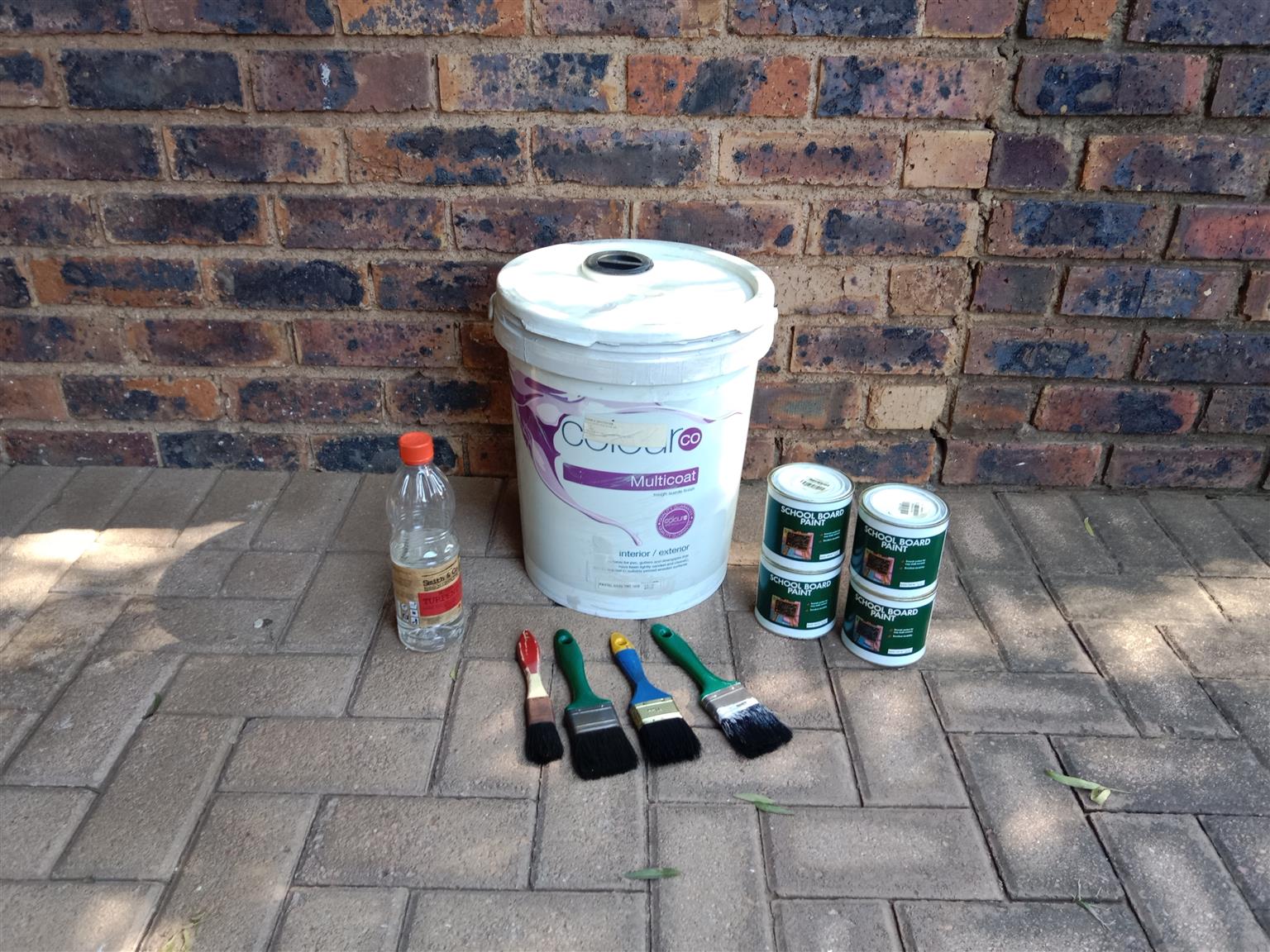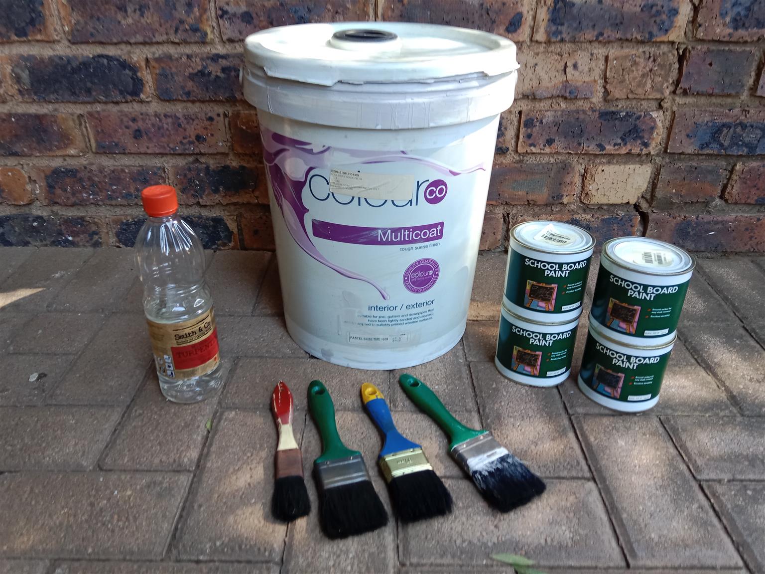 The 4x Black School Board Paint cans are brand new and have never been opened. All paint brushes (3x 50mm and 1x 25mm) are in very good, reusable condition. The light grey/stone "Boulders Rock" interior/exterior multicoat paint is still usable, with a generous amount left (approx. 1.5 - 2 litres). Turpentine is also included.