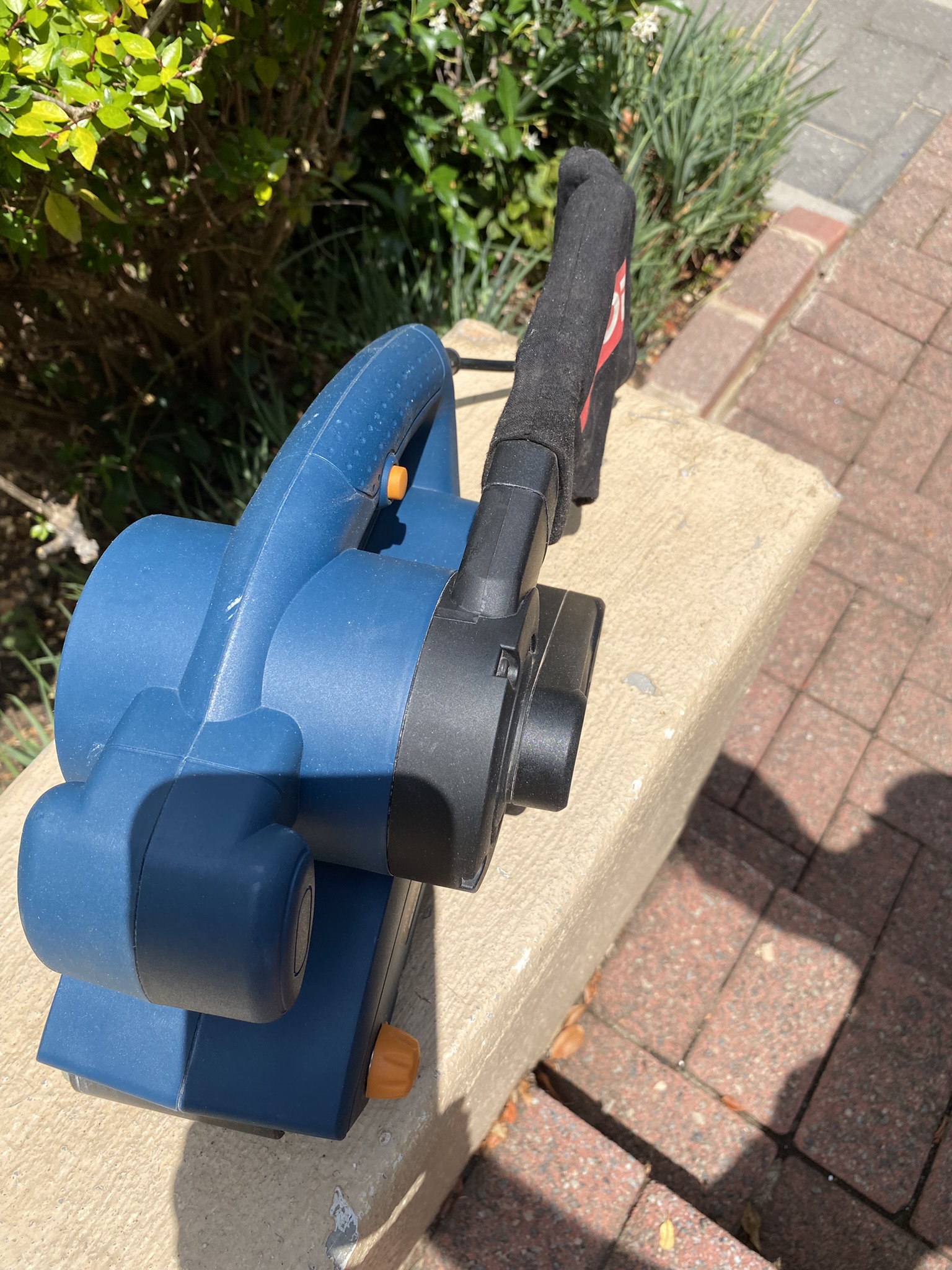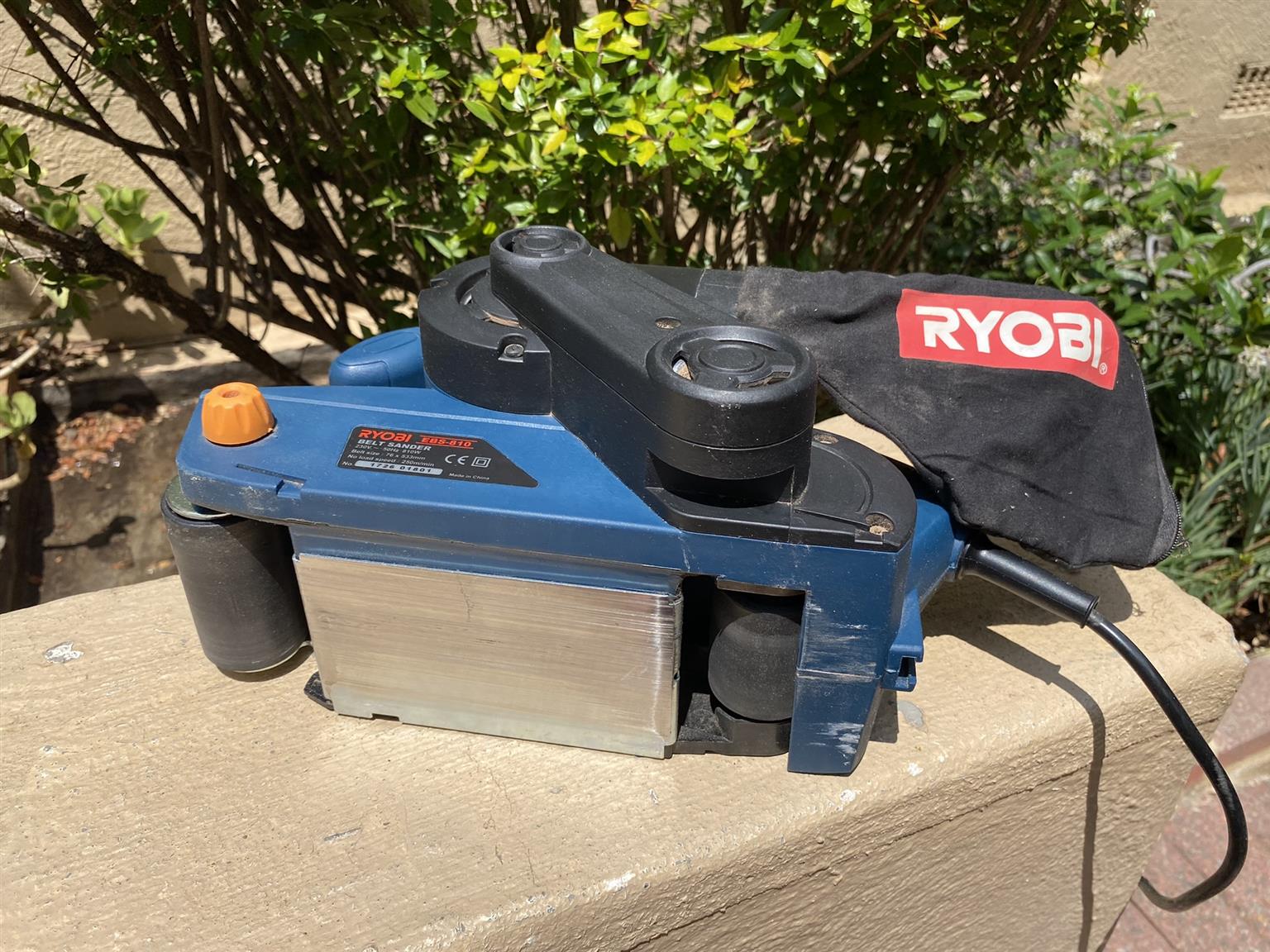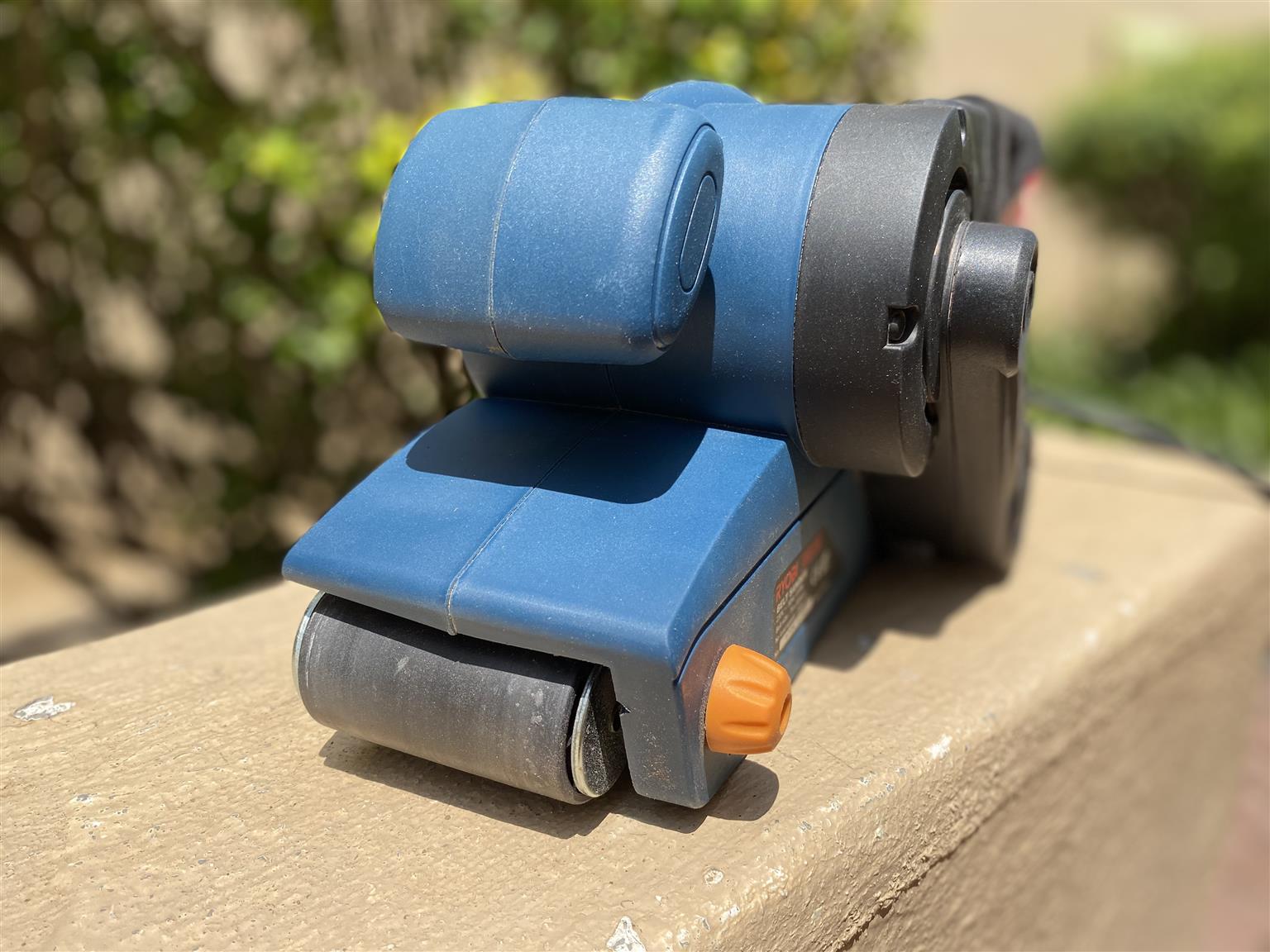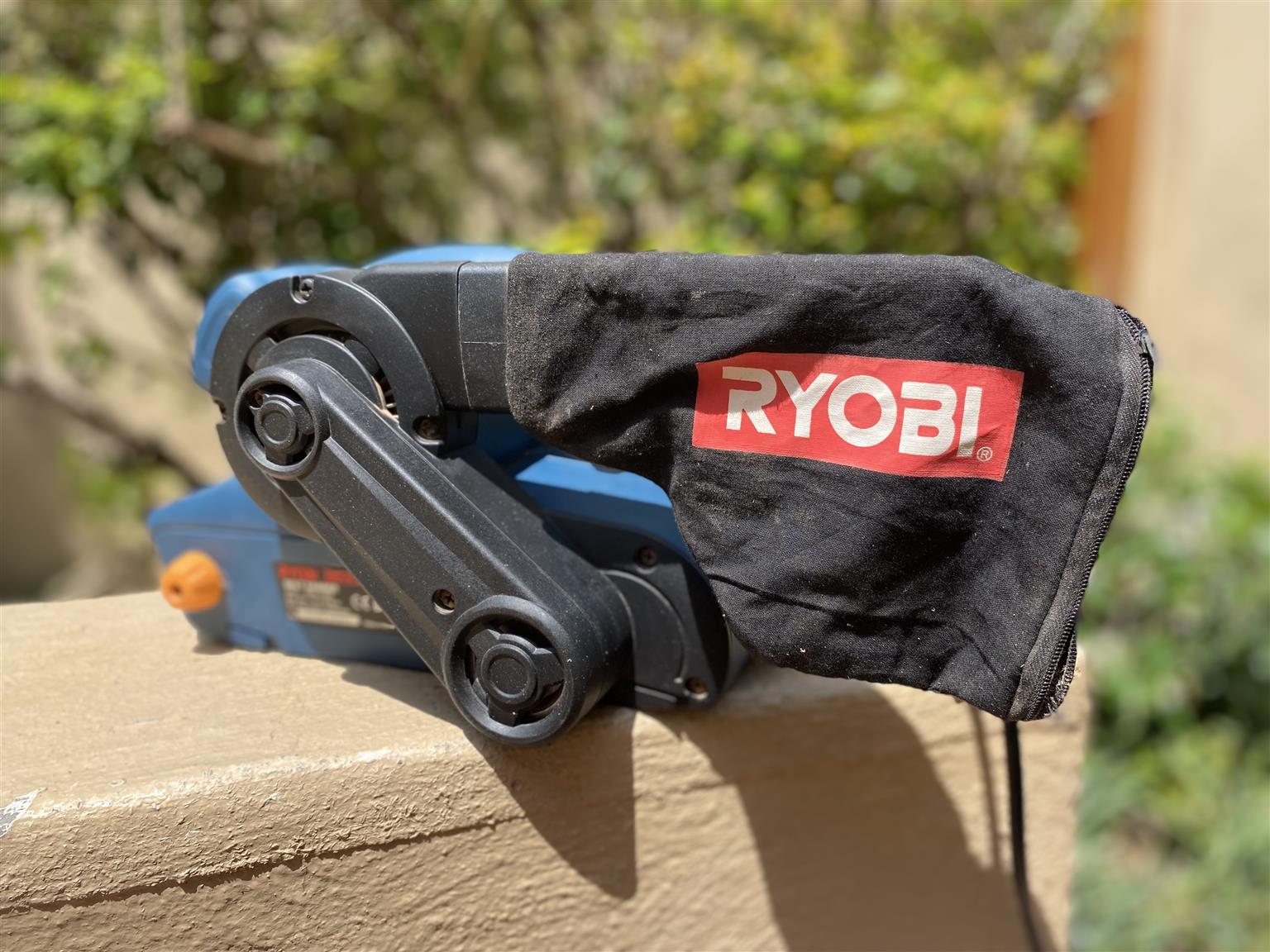 Standard accessories include dust bag and abrasive belt